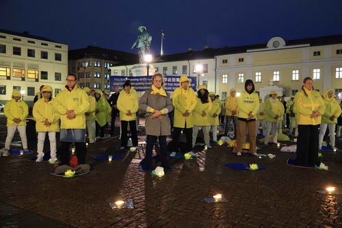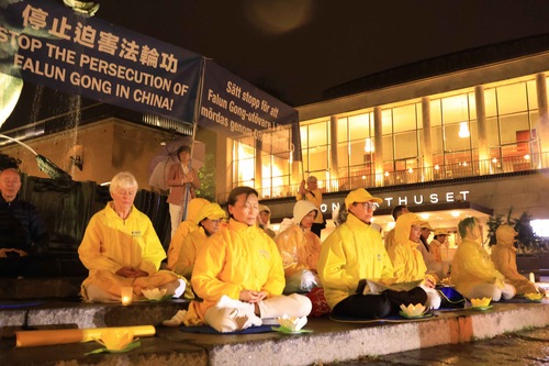 (Minghui.org) Praktykujący Falun Dafa zorganizowali czuwanie przy świecach i wspólnie praktykowali ćwiczenia na Gustaf Adolfs Torg w Göteborgu w Szwecji, 19 września 2025 roku.