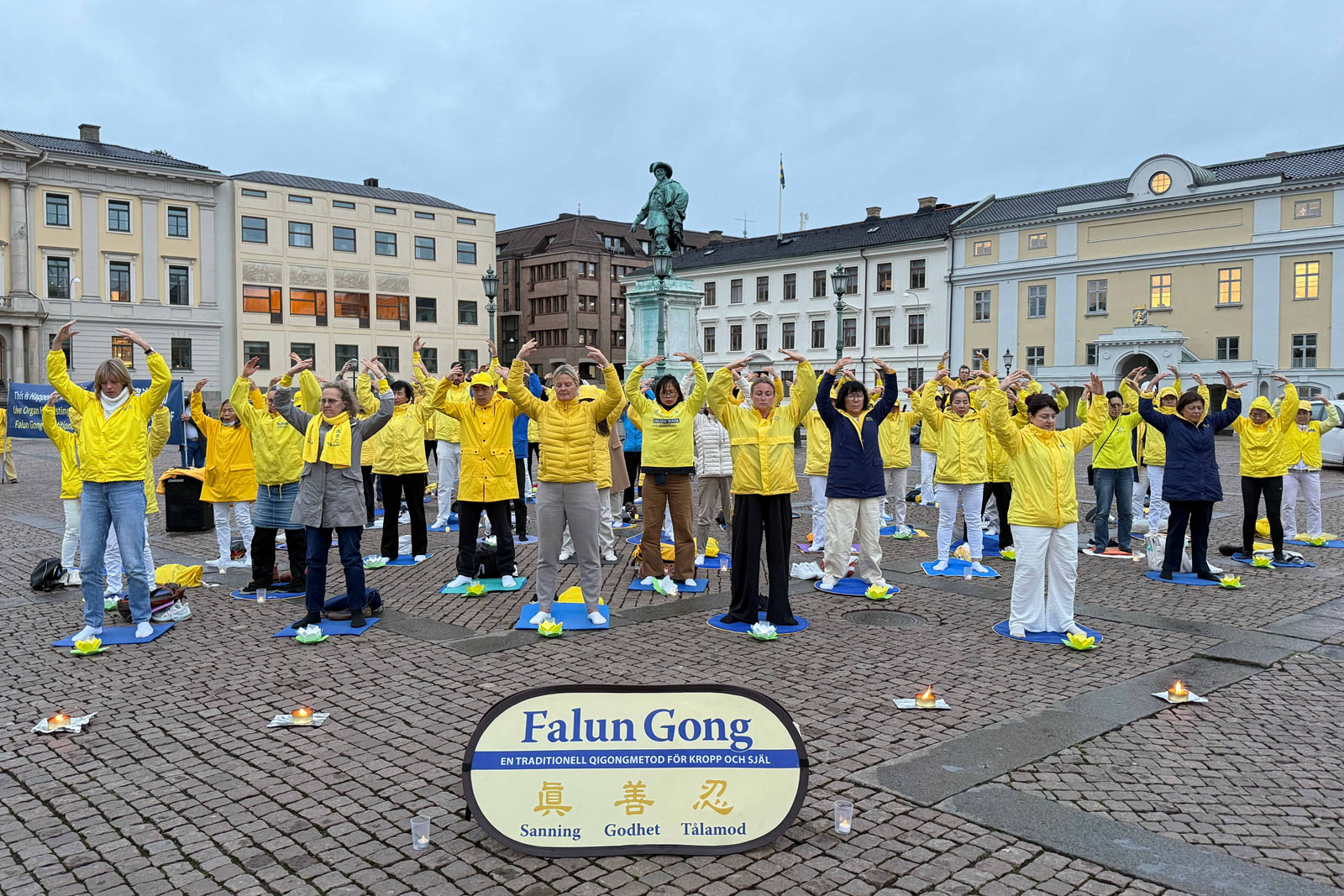 Praktykujący Falun Dafa zorganizowali czuwanie ze świecami na Gustav Adolfs Torg w Göteborgu i zaprezentowali ćwiczenia 19 września 2025 roku