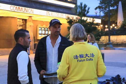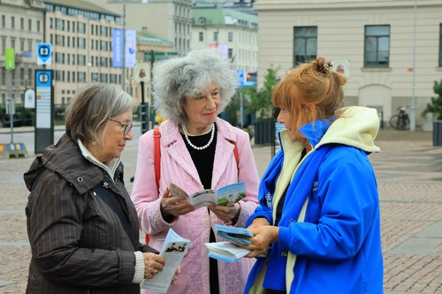 Ludzie opuszczający salę koncertową po zachodniej stronie placu Götaplatsen chcieli dowiedzieć się więcej o Falun Dafa