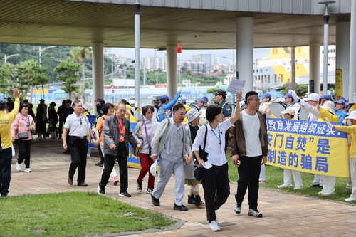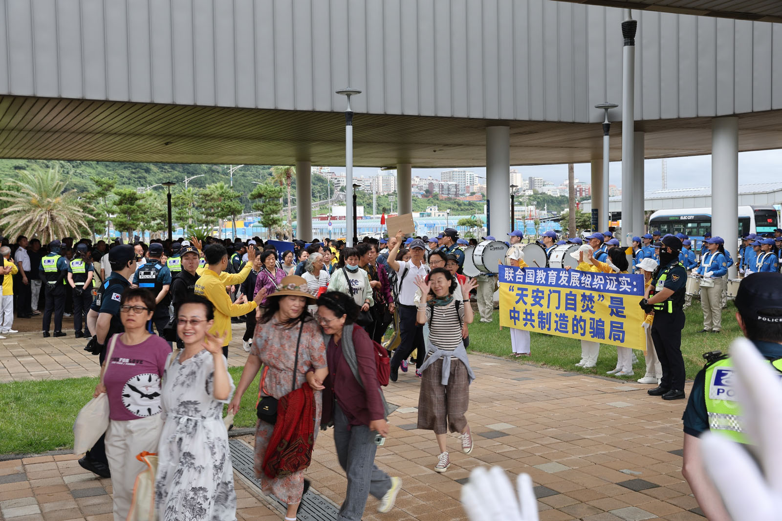 Ponieważ port jest mały, niektórzy praktykujący czekali przy wyjściu z transparentami, aby turyści w autobusach mogli je przeczytać. Następnie praktykujący udali się do sklepu wolnocłowego Lotte w mieście, gdzie występy Orkiestry Marszowej Tian Guo przyciągnęły wielu turystów.