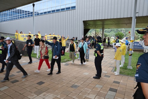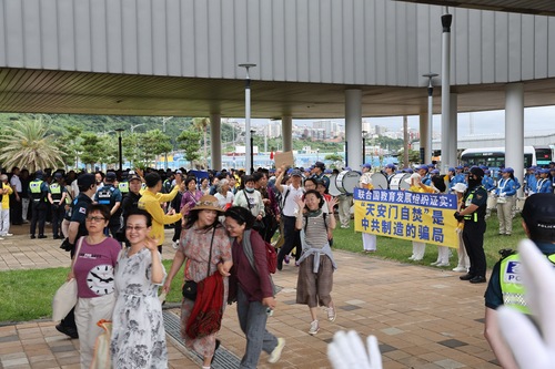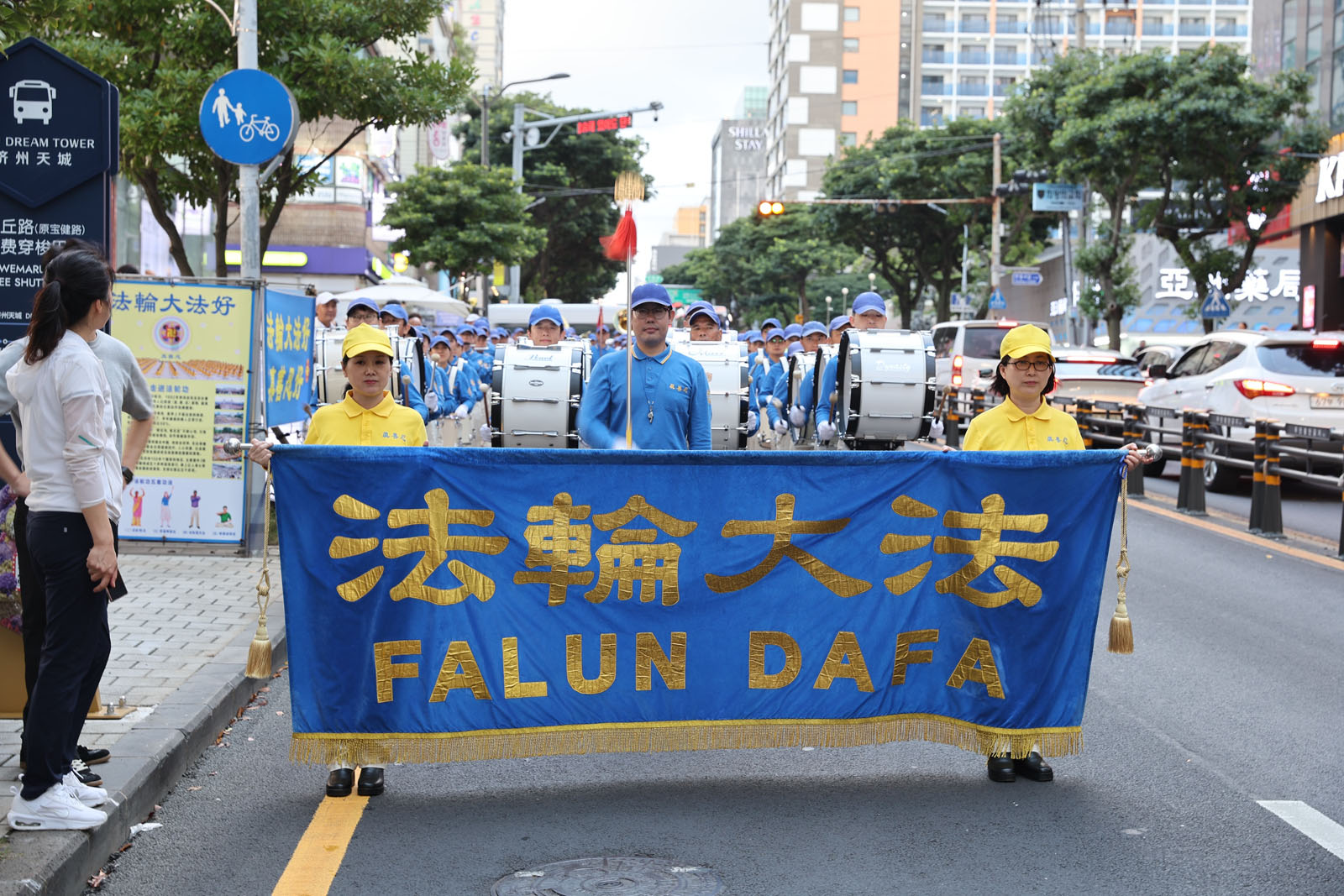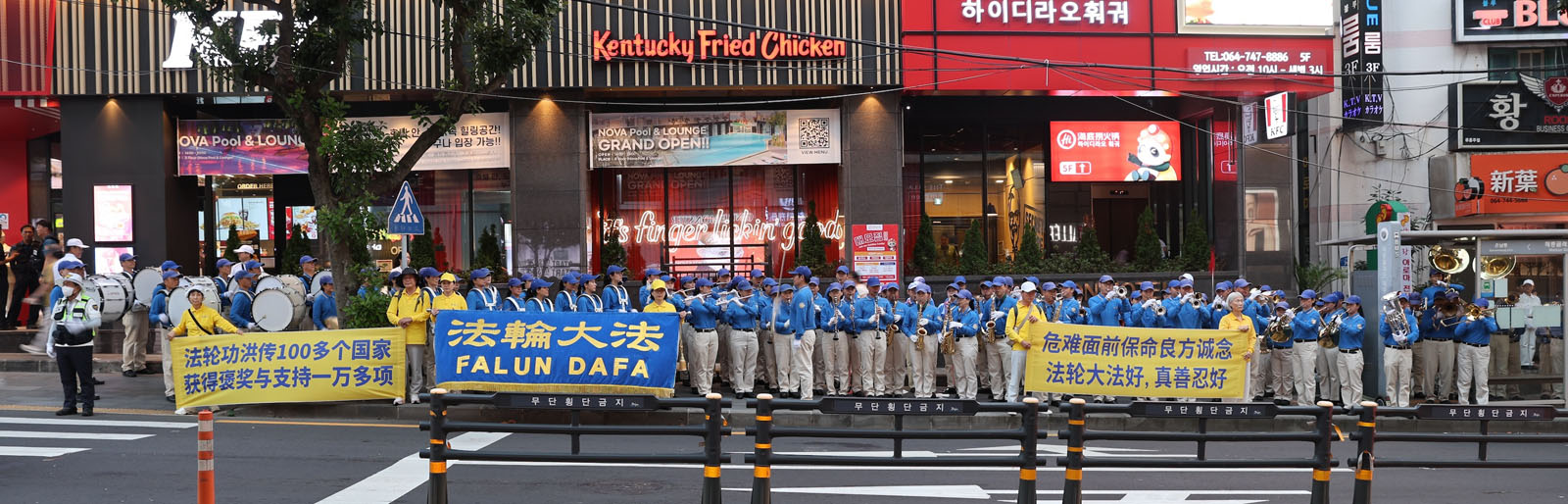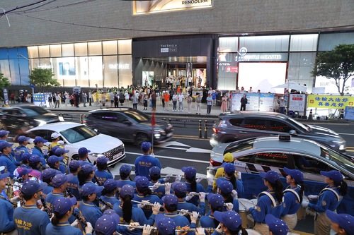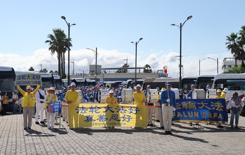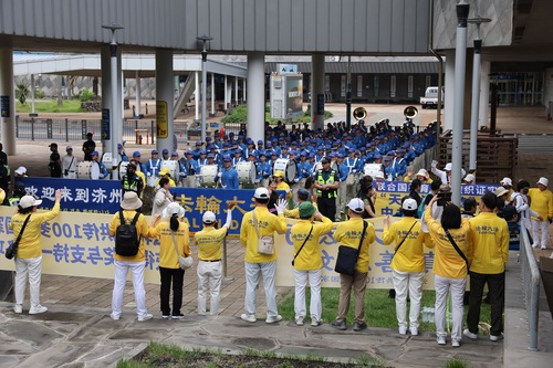 Orkiestra marszowa Tian Guo wystąpiła, a praktykujący rozwieszali transparenty w porcie wycieczkowym Seogwipo Gangjeong