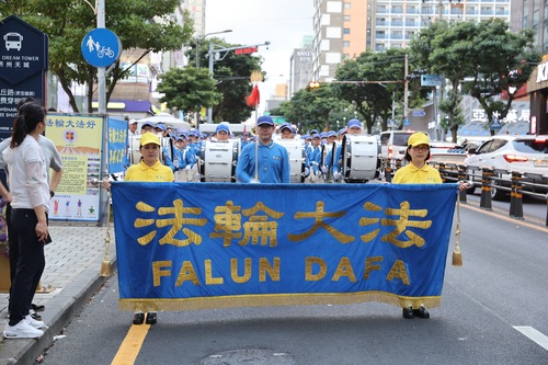 (Minghui.org) Wyspa Czedżu, największa wyspa Korei Południowej, stała się popularnym celem podróży dla Chińczyków dzięki polityce bezwizowej i bezpośrednim lotom. Aby pomóc im poznać Falun Dafa i uwolnić się od zniesławiającej propagandy Komunistycznej Partii Chin (KPCh), praktykujący Falun Dafa rozwieszają banery, rozdają materiały, a Orkiestra Marszowa Tian Guo daje występy.