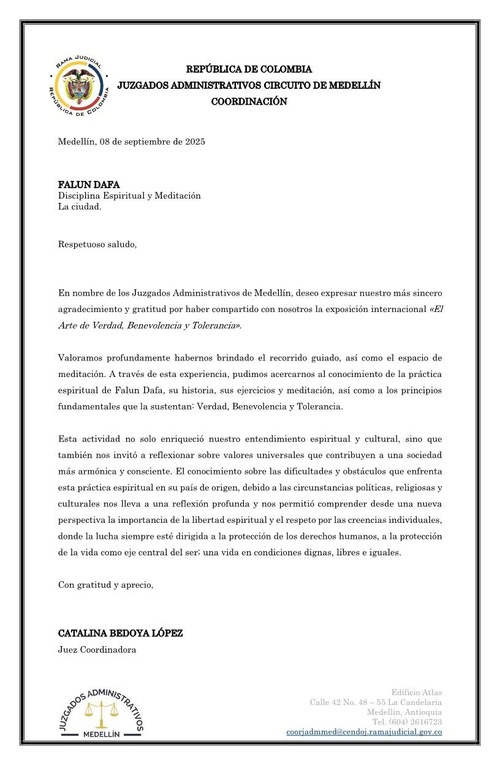 Sędzina Catalina Bedoya López napisała: „Bardzo cenimy sobie wycieczkę z przewodnikiem, a także udostępnioną przez Państwa przestrzeń do medytacji. Dzięki temu doświadczeniu mogliśmy dowiedzieć się więcej o duchowej praktyce Falun Dafa, jej historii, ćwiczeniach i medytacji, a także o fundamentalnych zasadach, na których się opiera: Prawdzie, Życzliwości i Tolerancji”.