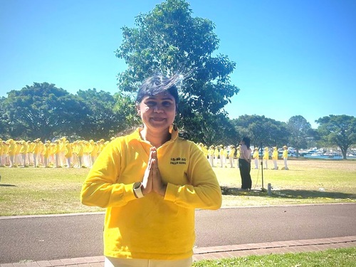 Wzięła również udział w paradzie praktykujących w centrum Sydney dzień wcześniej. „Tak wielu ludzi oglądało paradę. Wczoraj ludzie składali dłonie w geście Heshi i pokazywali nam kciuki w górę. Wydawali się bardzo szczęśliwi. Myślę, że to dlatego, że wiedzą o prześladowaniach prowadzonych przez rząd Chin od dawna, wspierają prawa człowieka i wiedzą, że Falun Dafa jest dobre. Naprawdę dobre".