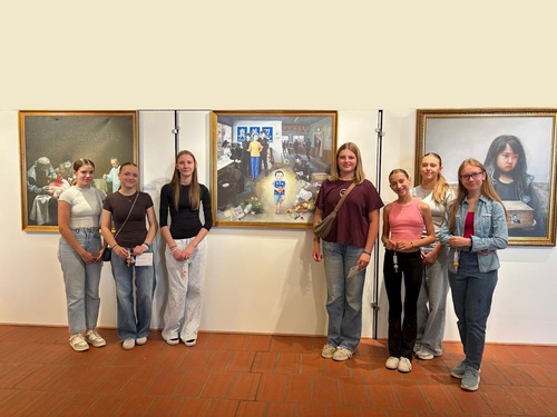 Wystawę odwiedziło kilku uczniów ze szkół w Donauwörth. Skierowali się prosto do obrazu „Zachowanie skarbu” i zrobili sobie zdjęcie.