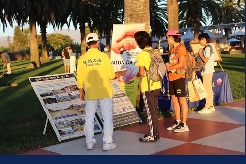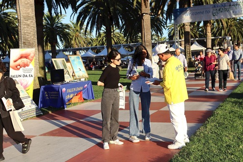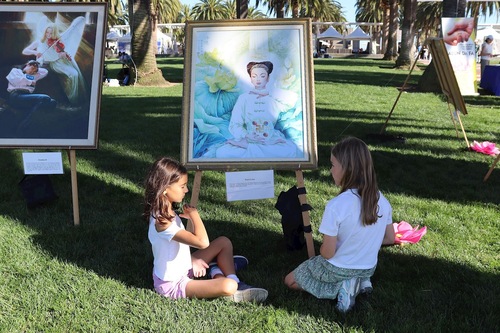 Praktykujący zaprezentowali na trawniku obrazy z Międzynarodowej Wystawy Sztuki Zhen, Shan, Ren. Ludzie zatrzymywali się, by podziwiać je i zadawać pytania. Podczas gdy dwie kobiety zadawały pytania, towarzyszące im dziewczęta podeszły do obrazów, a następnie usiadły, by naśladować pozycje medytacyjne postaci na obrazach. Podszedł młody praktykujący, by nauczyć je ruchów, a one po ćwiczeniu z radością wyszły, niosąc w prezencie małe kwiaty lotosu.