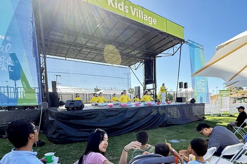 Praktykujący Falun Dafa zaprezentowali pięć zestawów ćwiczeń na scenie i na trawniku podczas 24. Festiwalu Globalnej Wioski w Irvine, 11 października 2025 r.