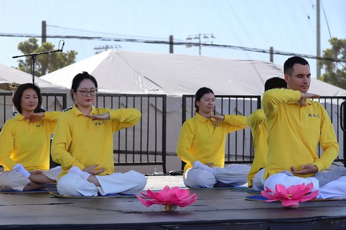 Praktykująca Falun Dafa przedstawiła ćwiczenia na scenie i opowiedziała, jak praktyka wpłynęła na jej zdrowie i samopoczucie. Następnie praktykujący zademonstrowali pięć zestawów ćwiczeń przy akompaniamencie kojącej muzyki.
