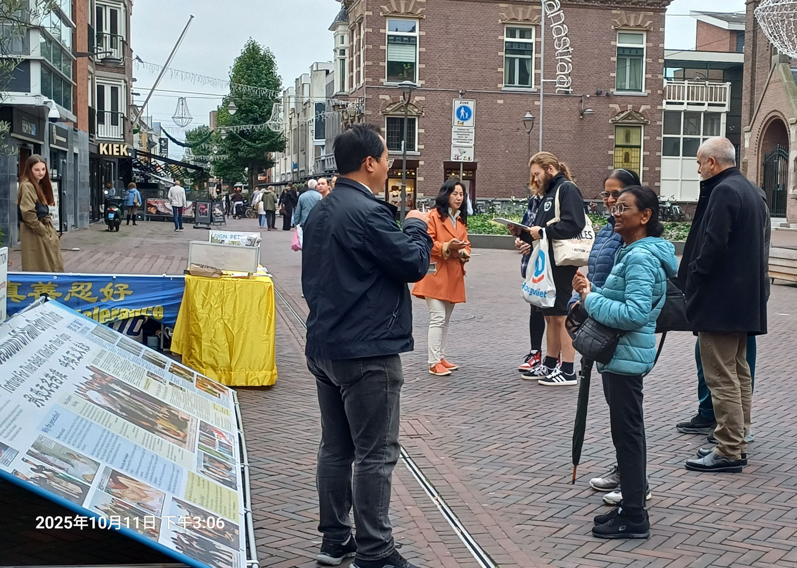 (Minghui.org) 11 października 2025 roku wydarzenie informacyjne w ramach objazdowej akcji dotarło do miasta Alphen aan den Rijn w południowej Holandii. Celem było przybliżenie mieszkańcom praktyki Falun Dafa oraz podniesienie świadomości na temat prześladowań prowadzonych przez Komunistyczną Partię Chin (KPCh).