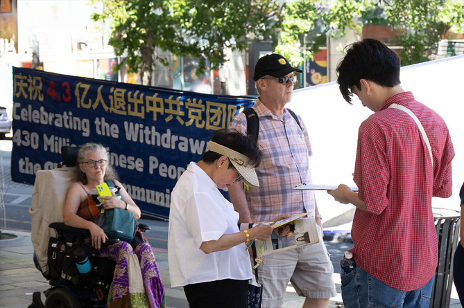 Turysta zapytał praktykującego: „Czy zachęcasz ludzi do praktykowania Falun Dafa?”. Praktykujący wyjaśnił, że ich celem jest wyjaśnienie prawdy o prześladowaniach, obalenie oszczerstw Komunistycznej Partii Chin i wezwanie do ich zakończenia. Praktykujący wyjaśnił, że KPCh kłamie na temat Falun Dafa, w tym o mistyfikacji samospalenia na placu Tiananmen, i że KPCh rozszerzyła teraz swoje prześladowania za granicę, na przykład poprzez ingerencję w Shen Yun Performing Arts.
