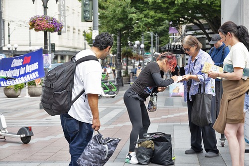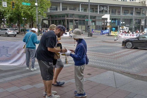 (Minghui.org) Praktykujący Falun Dafa regularnie organizują w centrum Seattle działania mające na celu obnażenie prześladowań Komunistycznej Partii Chin (KPCh) poprzez eksponowanie banerów, rozdawanie ulotek i zbieranie podpisów pod petycjami. Przez lata ich wytrwałość i współczucie zdobyły szacunek i poparcie opinii publicznej.