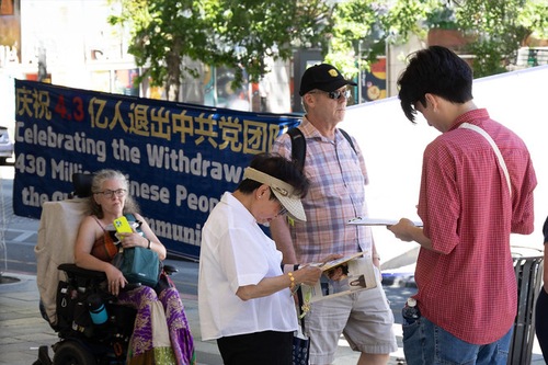 Wzruszeni wytrwałym wysiłkiem praktykujących Falun Dafa, niektórzy próbują przekazać darowiznę lub przynieść praktykującym jedzenie. Praktykujący grzecznie odmawiają i wyjaśniają, że po prostu chcą szerzyć prawdę. Pan Zhang, lokalny mieszkaniec, powiedział praktykującym: „Podziwiam waszą wytrwałość! Dziękuję za przekazanie nam tych wszystkich faktów. Wykonujcie dalej świetną robotę!”.