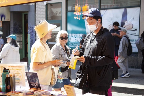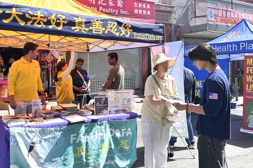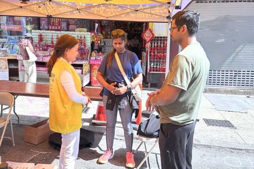 Praktykujący rozmawiają z gośćmi o Falun Dafa i prześladowaniach KPCh podczas obchodów Jesiennego Święta Księżyca w Chinatown, 27 i 28 września 2025 roku