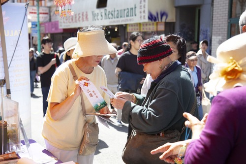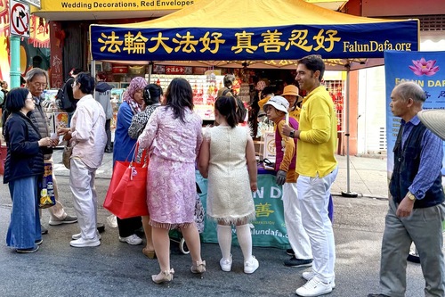 (Minghui.org) Praktykujący Falun Dafa uczestniczyli w Jesiennym Święcie Księżyca w dzielnicy Chinatown w San Francisco, które odbyło się w dniach 27-28 września 2025 r. Przedstawili Falun Dafa (znane również jako Falun Gong) i podnieśli świadomość na temat prześladowań ze strony Komunistycznej Partii Chin (KPCh). Wiele osób podpisało petycję wzywającą do zaprzestania sankcjonowanego przez państwo grabieży organów przez KPCh. Podczas wydarzenia niektórzy uczyli się ćwiczeń Falun Dafa.