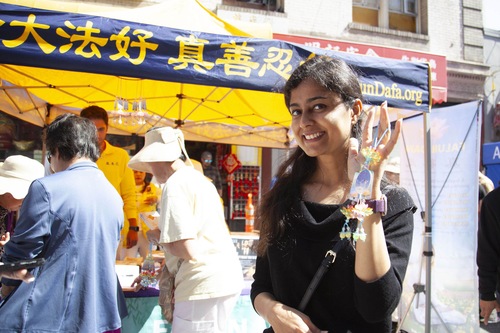 Ankita niedawno przeprowadziła się do San Francisco i powiedziała, że tego dnia chciała po prostu pójść na spacer i zobaczyła stoisko praktykujących. „Dzisiaj jest naprawdę wspaniały dzień. To wspaniałe uczucie uczyć się i praktykować Falun Dafa. Uwielbiam to”.