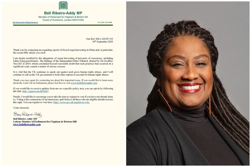 Posłanka Bell Ribeiro-Addy stwierdziła w swoim liście: „Jestem głęboko zaniepokojona zarzutami o pobieranie organów od więźniów sumienia, w tym od praktykujących Falun Gong. Ustalenia niezależnego Trybunału ds. Chin, pod przewodnictwem sir Geoffreya Nice'a KC z 2019 roku, który stwierdził ponad wszelką wątpliwość, że takie praktyki miały miejsce na znaczną skalę, pozostają przedmiotem poważnego zaniepokojenia”.