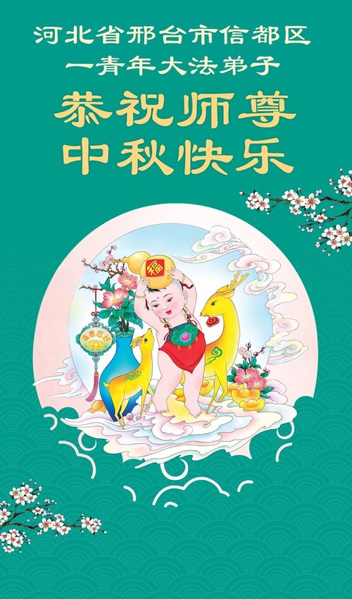 „Nie praktykowałem [Falun Dafa] od dawna, ale czułem korzyści zdrowotne płynące z Falun Dafa, a także moc Prawdy-Życzliwości-Cierpliwości. Zdecydowanie będę wobec siebie surowy, aby być dobrym i lepszym człowiekiem. Dziękuję, Mistrzu Li, i życzę Ci Szczęśliwego Święta Środka Jesieni!” – napisał młody praktykujący z miasta Tianmen w prowincji Hubei.