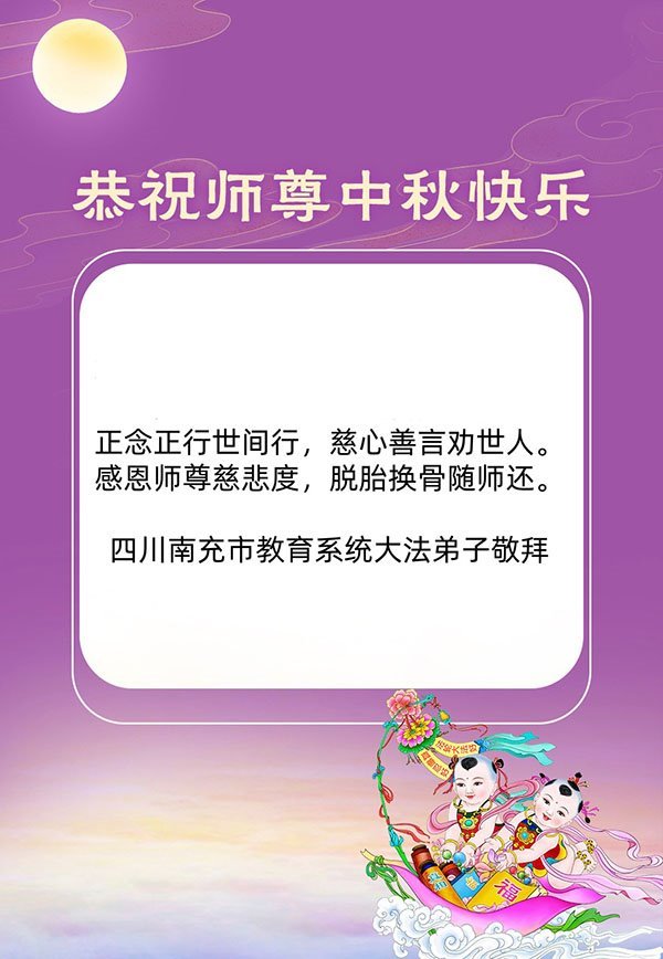 (Minghui.org) Z okazji Święta Środka Jesieni (znanego również jako Święto Księżyca), portal Minghui.org otrzymał liczne życzenia z okazji świąt Mistrzowi Li Hongzhi, założycielowi Falun Dafa. Poniżej znajduje się 19 wybranych życzeń od praktykujących pracujących w chińskim systemie edukacji. Podziękowali Mistrzowi Li za jego pełne współczucia zbawienie i życzyli Mu wesołych świąt.