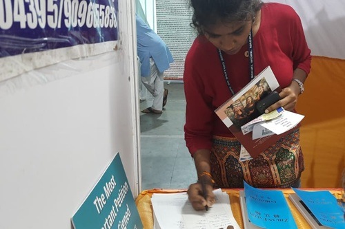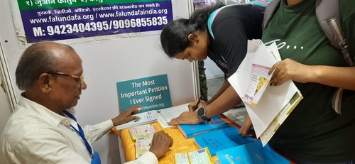 (Minghui.org) Praktykujący Falun Dafa z Nagpur w Indiach uczestniczyli w wystawie Gramayan Abhyuday Sewa w Taya Hope Hall w dniach 12-14 września 2025 roku, aby zaprezentować Falun Dafa. Zorganizowali stoisko, aby przybliżyć praktykę odwiedzającym z różnych środowisk i poinformować ludzi o trwających prześladowaniach w Chinach.