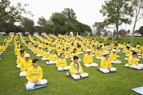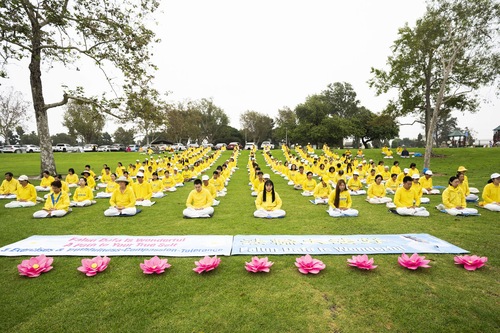 Praktykujący Falun Gong z obszaru Greater Los Angeles zebrali się w Mile Square Regional Park w Fountain Valley w Orange County w niedzielę 21 września 2025 r., aby złożyć świąteczne pozdrowienia Mistrzowi Li Hongzhi, założycielowi Falun Gong