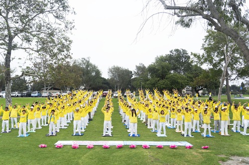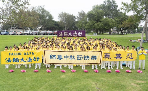 (Minghui.org) Z okazji Święta Środka Jesieni 2025, praktykujący Falun Gong z Los Angeles zebrali się w Mile Square Regional Park w Fountain Valley w hrabstwie Orange w niedzielę 21 września 2025 r. Wspólnie wykonali pięć zestawów ćwiczeń Falun Gong i złożyli życzenia założycielowi Falun Gong, Mistrzowi Li Hongzhi, radosnego Święta Środka Jesieni.
