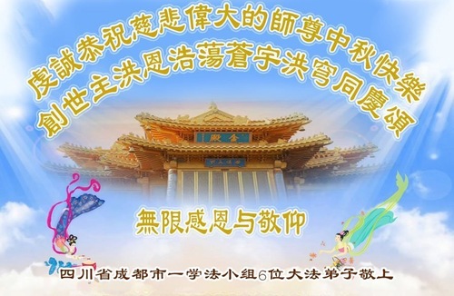 Sześcioro praktykujących z miasta Chengdu w prowincji Syczuan, wszyscy po osiemdziesiątce, często wspólnie czyta nauki Falun Dafa. Życzą Mistrzowi Li szczęśliwego Święta Środka Jesieni!