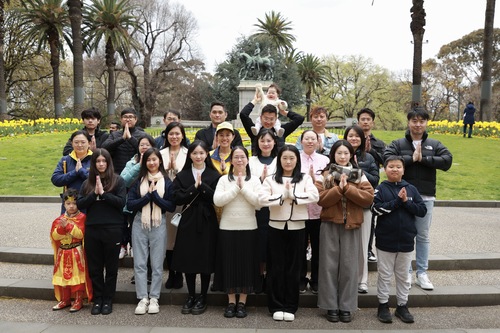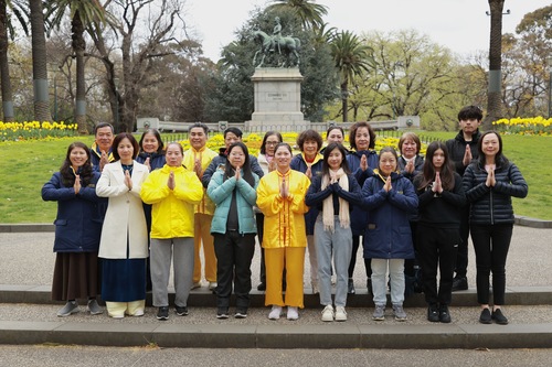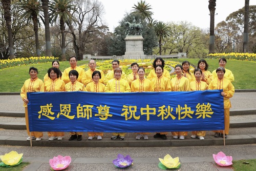 (Minghui.org) Przed Świętem Środka Jesieni 2025, 6 października, praktykujący Falun Dafa zrobili sobie grupowe zdjęcie przy zegarze kwiatowym w Ogrodach Królowej Wiktorii w Melbourne. Wyrazili wdzięczność swojemu założycielowi, Mistrzowi Li Hongzhi.