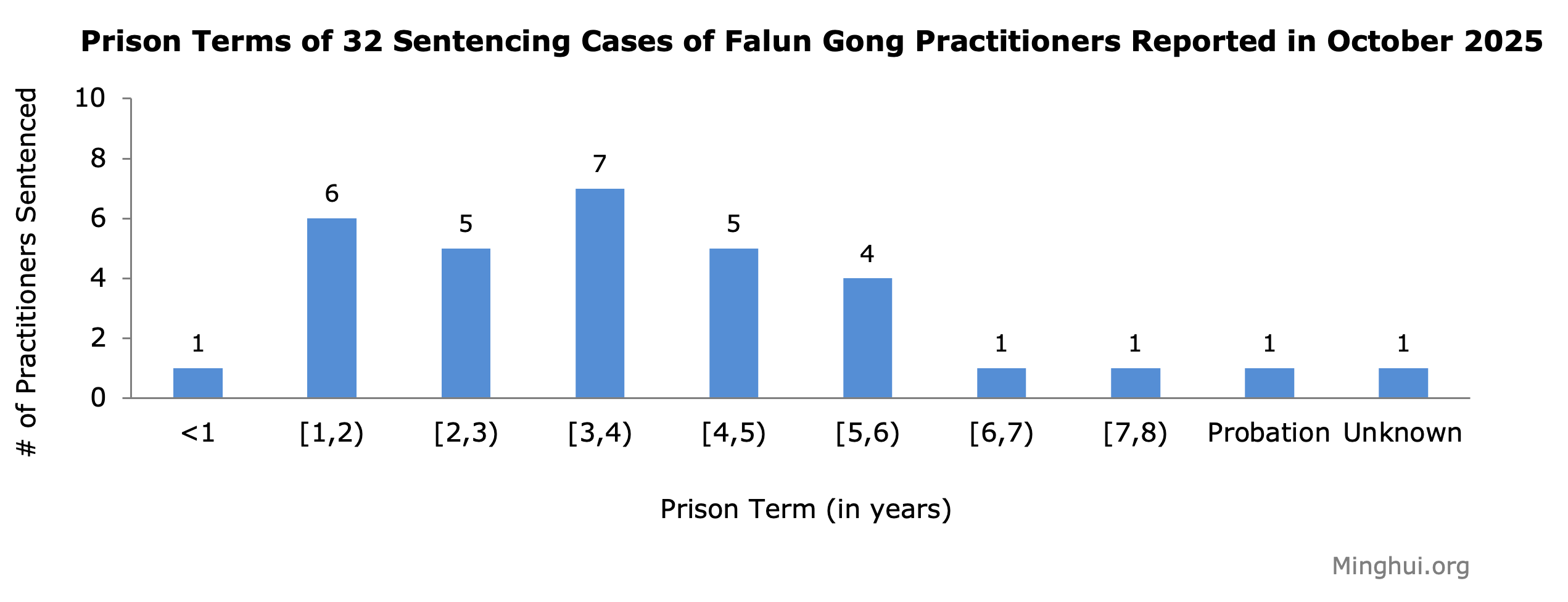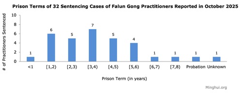 (Minghui.org) W październiku 2025 roku zgłoszono łącznie 32 przypadki skazywania praktykujących Falun Gong na karę więzienia za wyznawaną wiarę.