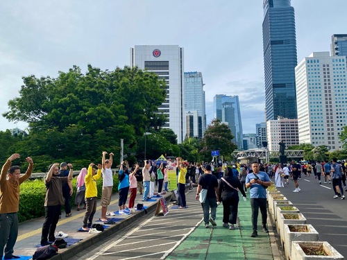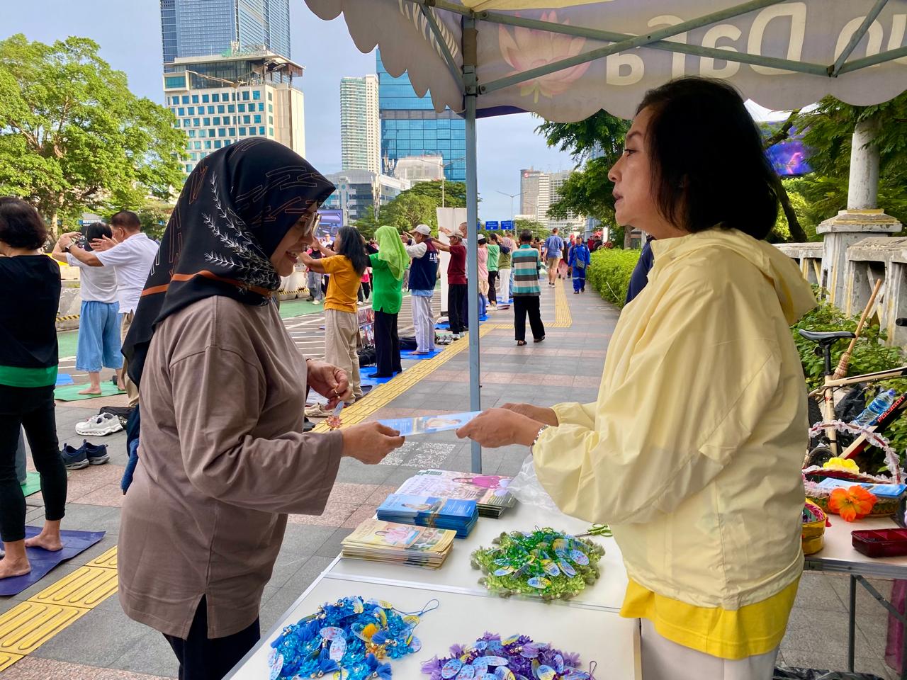 Praktykujący Falun Dafa zaprezentowali również tę praktykę podczas Dnia bez Samochodu w centrum Dżakarty w niedzielę rano, 9 listopada 2025 r. Cotygodniowa impreza, organizowana przez władze prowincji, ma na celu promowanie znaczenia czystego powietrza i zmniejszenie zależności od prywatnych pojazdów w ramach działań na rzecz poprawy jakości powietrza w stolicy. Praktykujący Falun Dafa uczestniczą w tym wydarzeniu raz w miesiącu.
