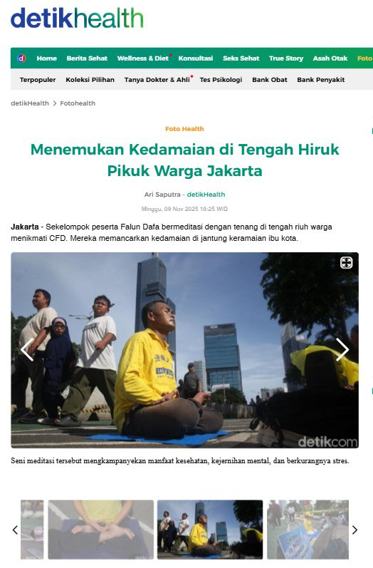 Krajowe media internetowe opisały działania praktykujących tego ranka: „Odnajdywanie spokoju wśród zgiełku mieszkańców Dżakarty. Grupa uczestników Falun Dafa medytowała spokojnie wśród tętniącego życiem tłumu, ciesząc się dniem bez samochodów. Promieniowali spokojem w samym sercu tętniącej życiem stolicy”.
