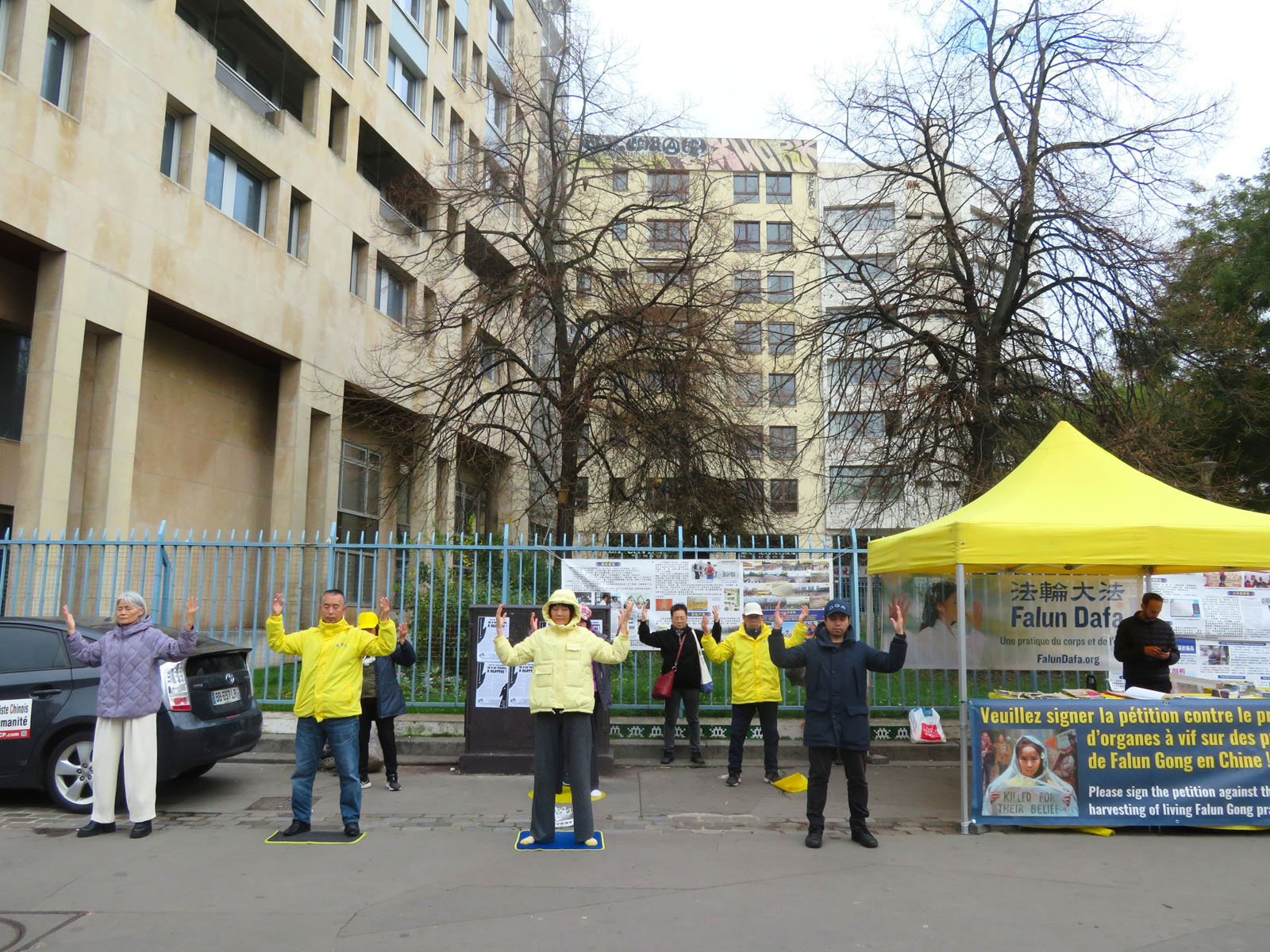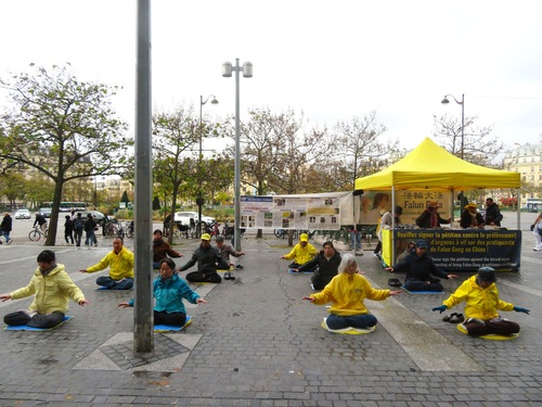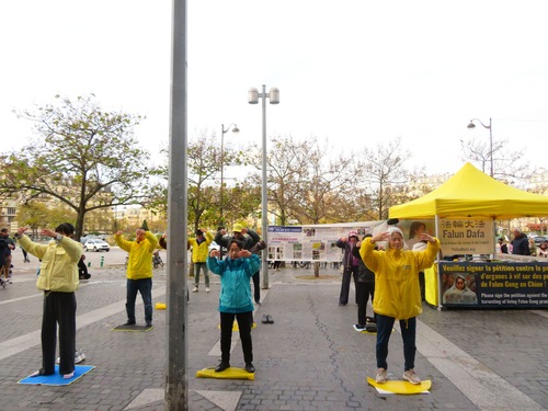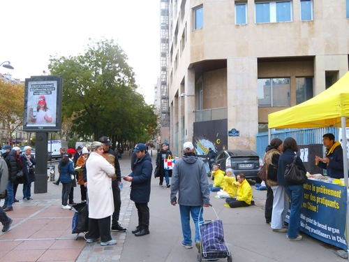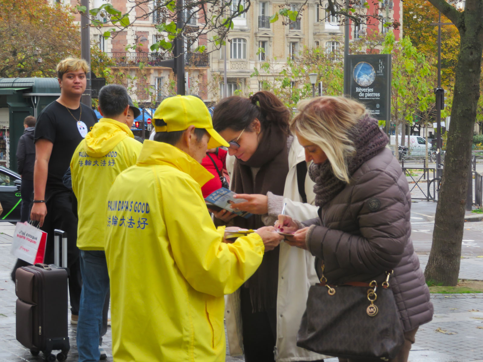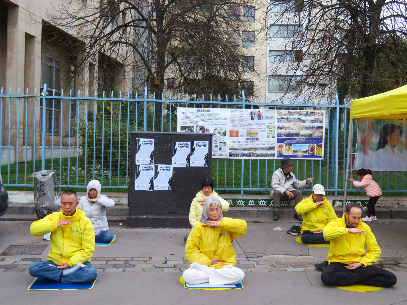 11 listopada jest dniem świątecznym we Francji. Praktykujący Falun Dafa zebrali się w Belleville, prezentowali ćwiczenia i rozmawiali z przechodniami o praktyce duchowej oraz prześladowaniach ze strony KPCh. Wiele osób podpisało petycję wzywającą do zaprzestania prześladowań. Kilku Chińczyków zrzekło się podczas imprezy członkostwa w KPCh i powiązanych z nią organizacjach młodzieżowych.