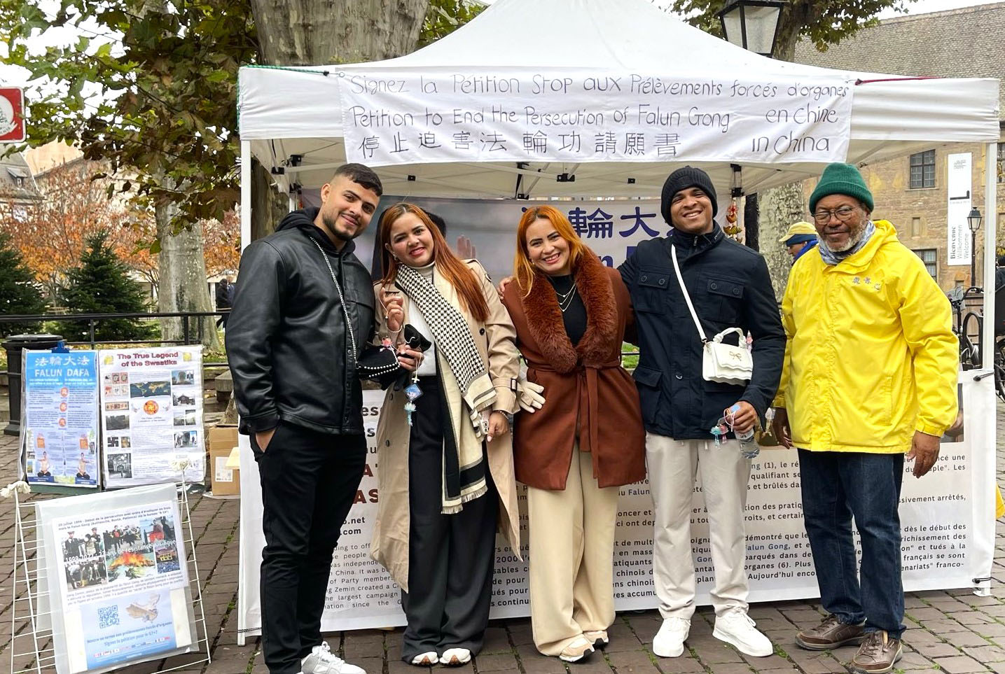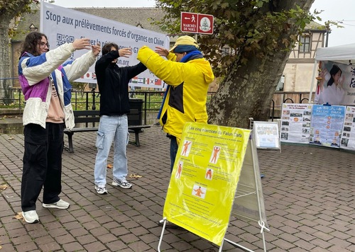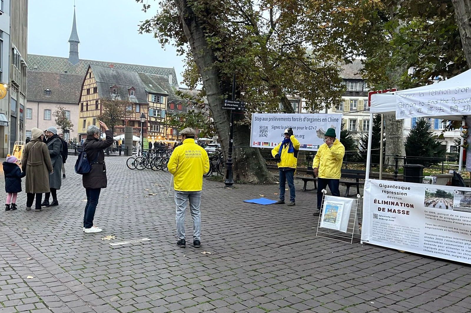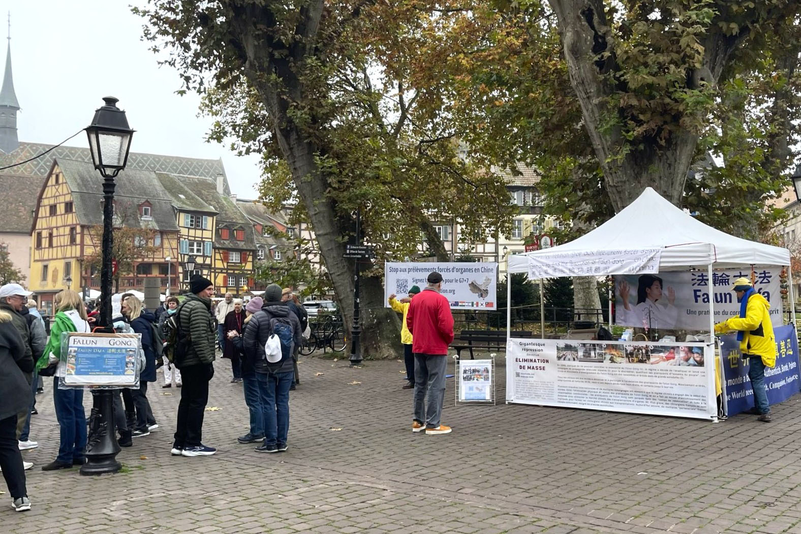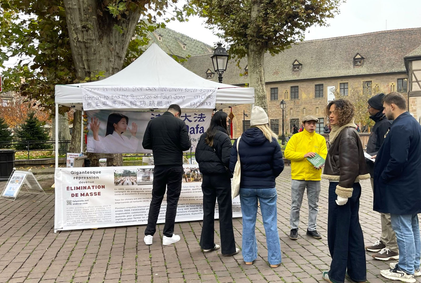 Praktykujący ze wschodniej Francji przeprowadzili działania w centrum Colmar 8 listopada 2025 r. Miejscowi mieszkańcy i turyści dowiedzieli się o Falun Dafa, a wielu z nich podpisało petycję wzywającą do zaprzestania przymusowego pobierania organów przez KPCh.