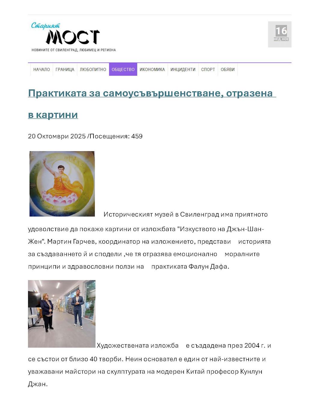 (Minghui.org) Międzynarodowa wystawa „Sztuka Zhen-Shan-Ren” została otwarta 20 października 2025 r. w Muzeum Historycznym miasta Svilengrad w Bułgarii. Wystawa będzie czynna przez miesiąc, do 20 listopada, a mieszkańcy będą mieli okazję poznać uniwersalne zasady Falun Dafa: Prawda, Życzliwość i Cierpliwość poprzez sztukę.