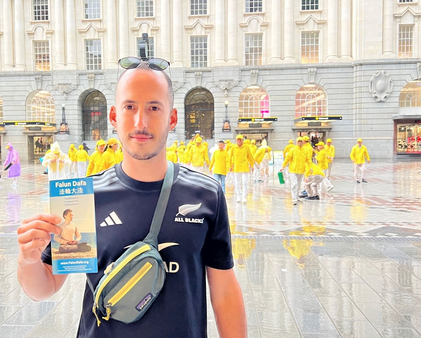Alex z Francji zatrzymał się i długo rozmawiał z praktykującym. Powiedział, że dowiedział się o Falun Dafa osiem lat temu, podczas wizyty w Kolumbii. Czuł, że praktykowanie Falun Dafa może przynieść ludziom spokój i przynieść im korzyści fizyczne i psychiczne.