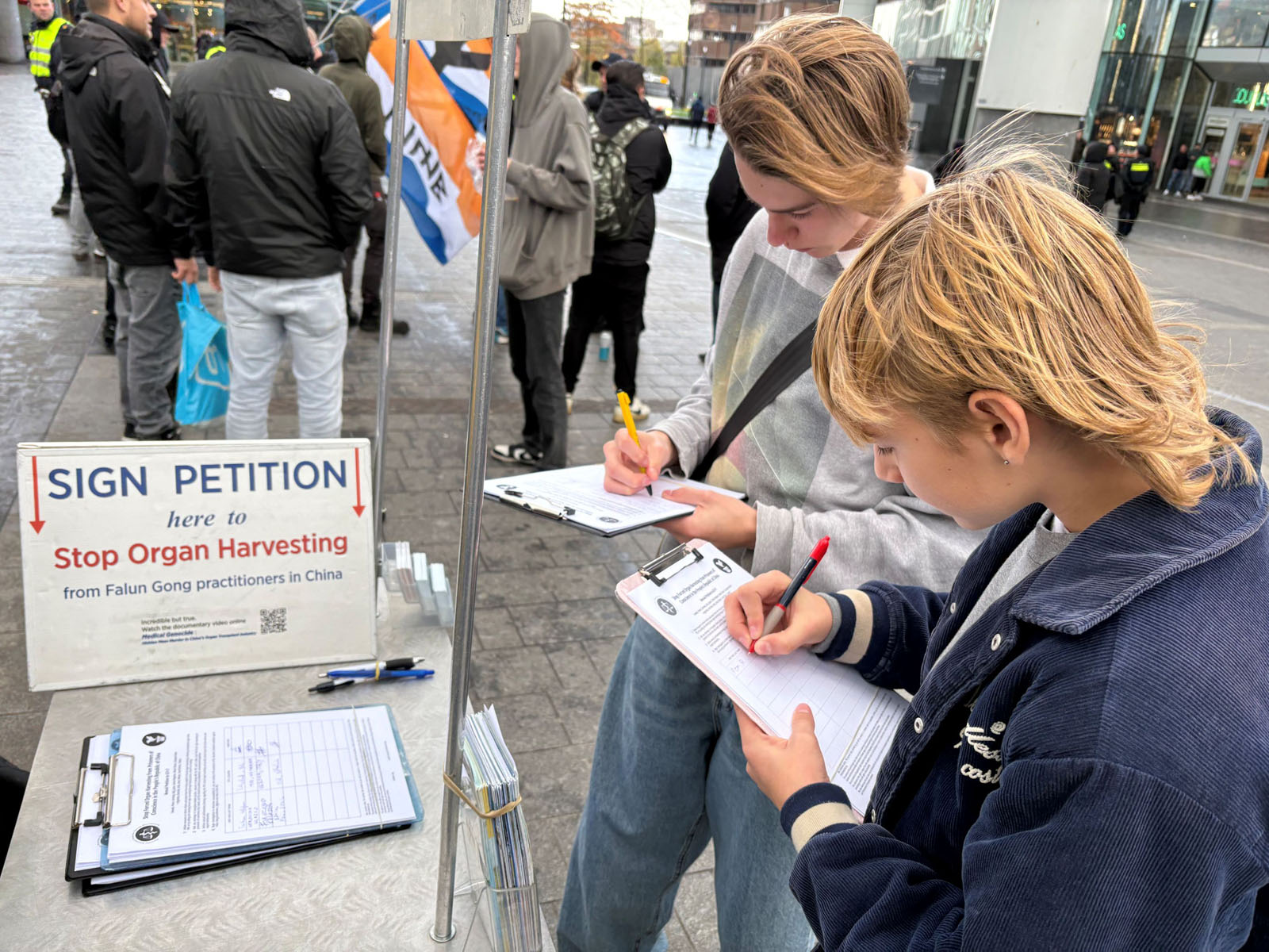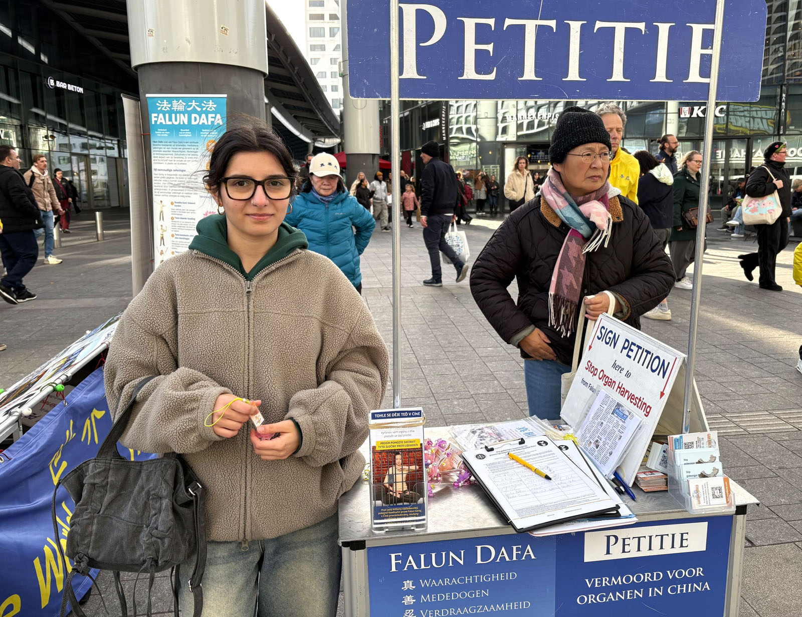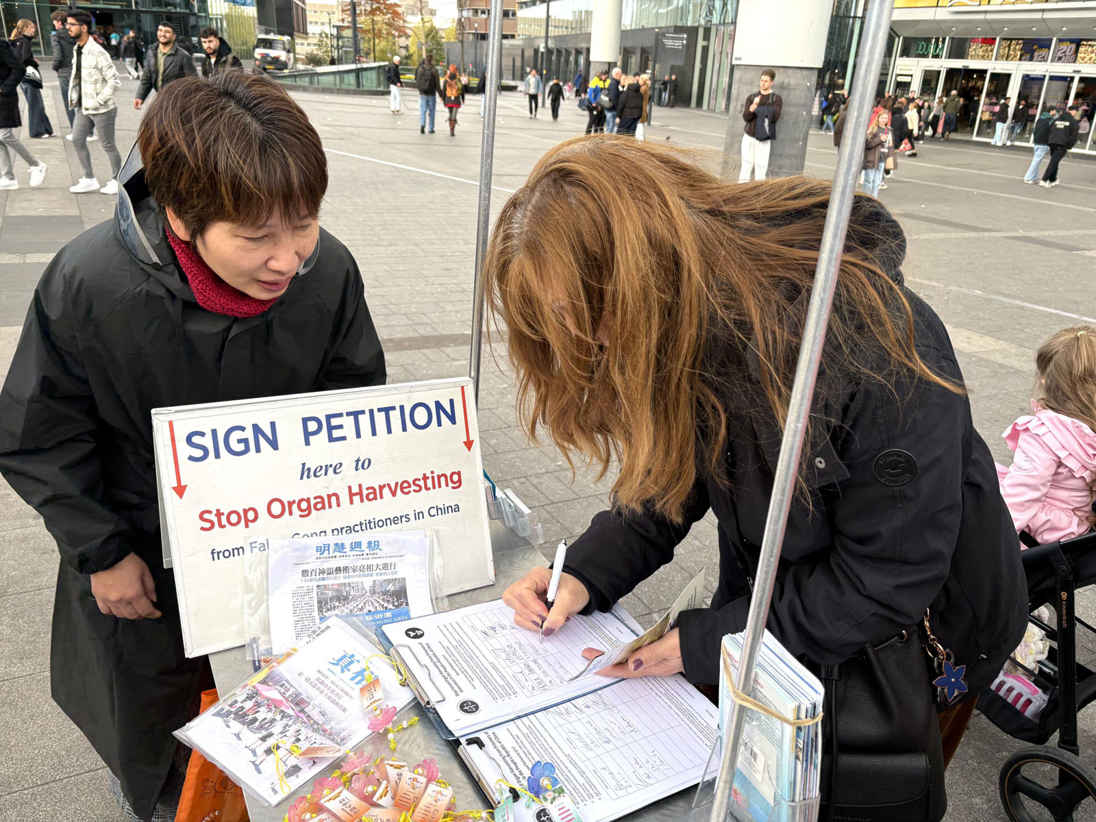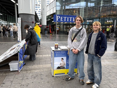 Mieszkańcy Utrechtu, Siem van Voorthuizen i Pom Reichert, podeszli do mównicy z petycją i zapytali o prześladowania. Po rozmowie z praktykującym Falun Dafa, oboje ją podpisali.
