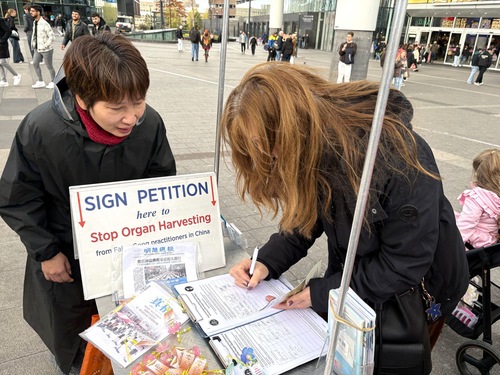 Ludzie podpisują petycję wzywającą do zakończenia prześladowań Falun Dafa przez Komunistyczną Partię Chin