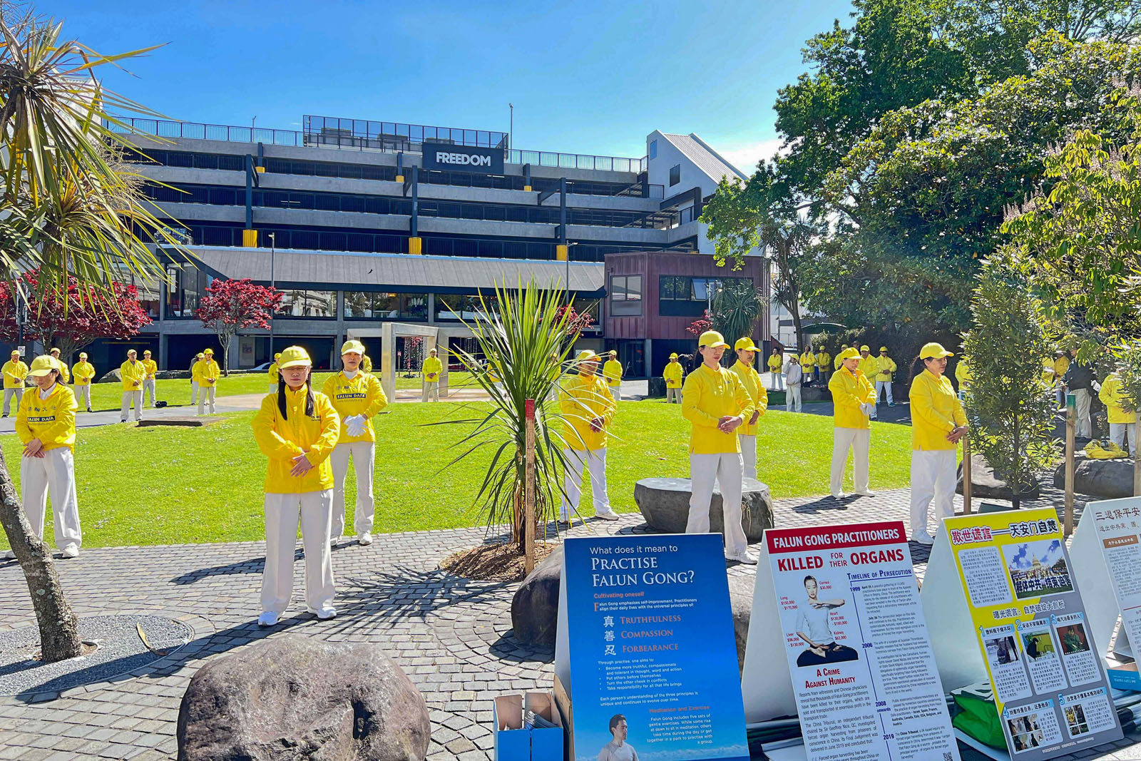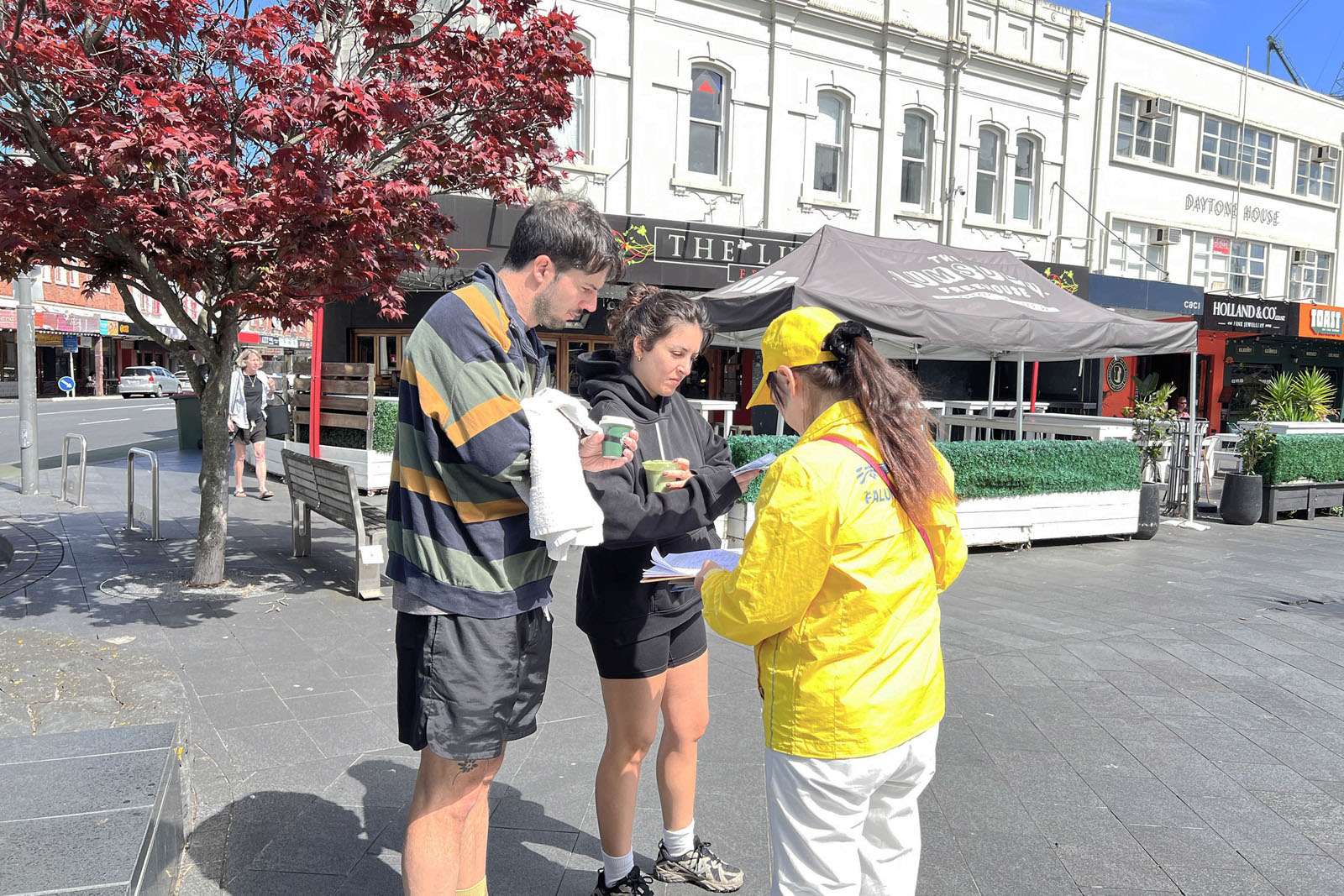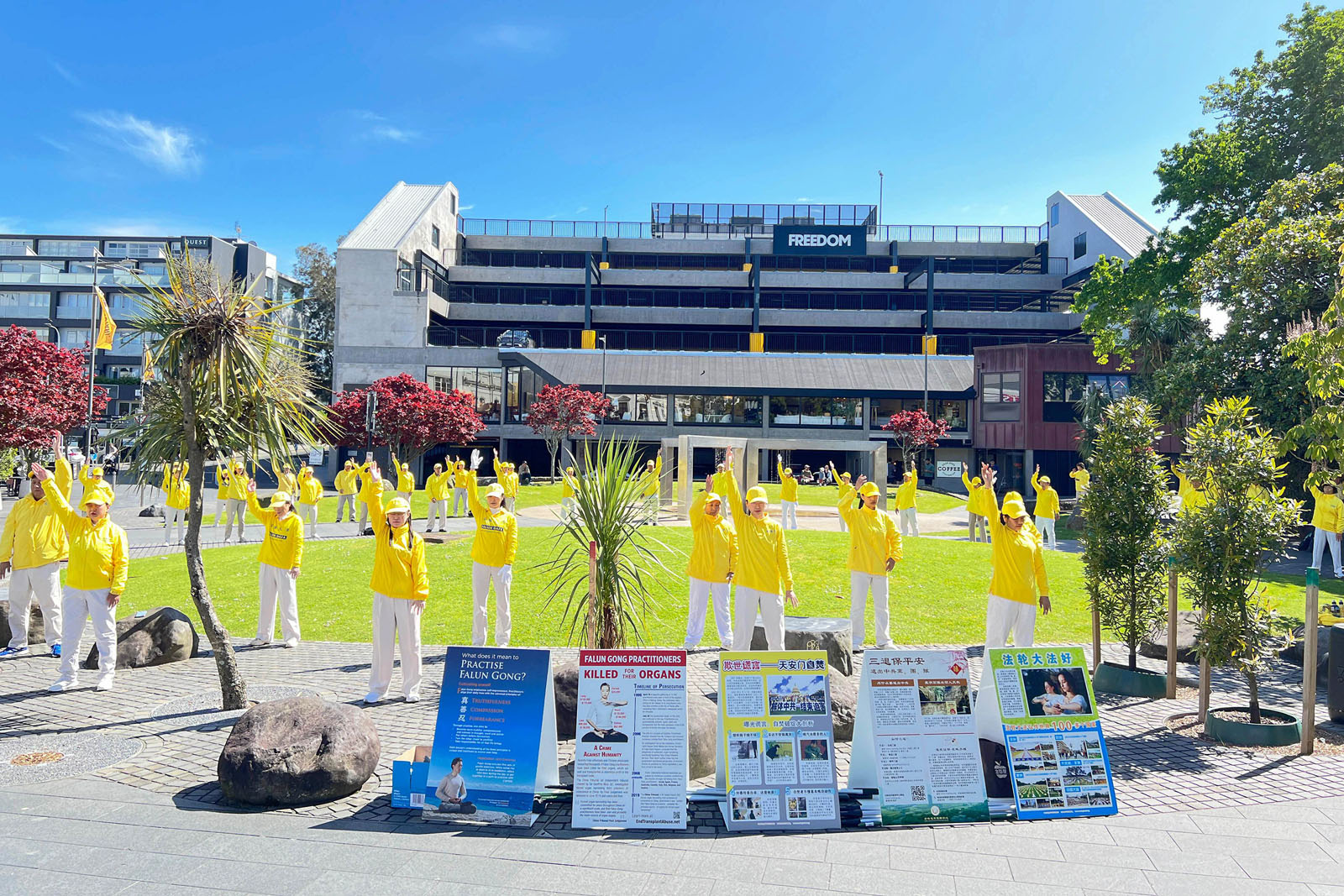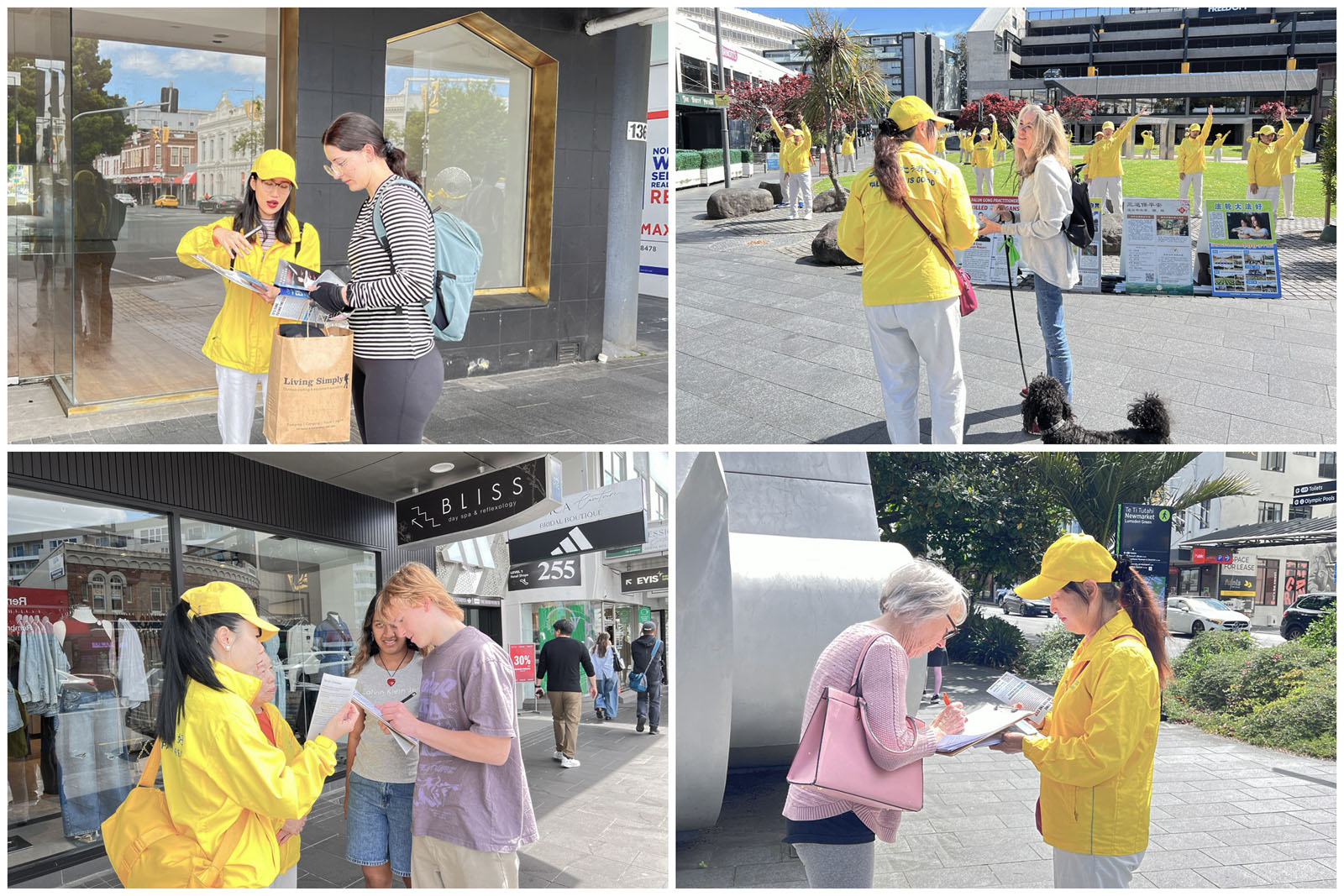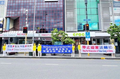 Praktykujący trzymali transparenty z informacjami o Falun Dafa w Newmarket, centrum handlowym Auckland