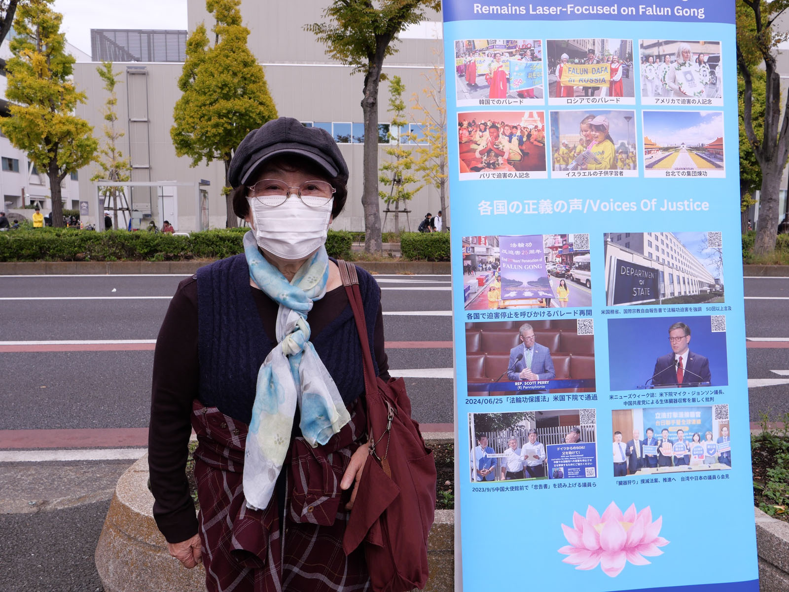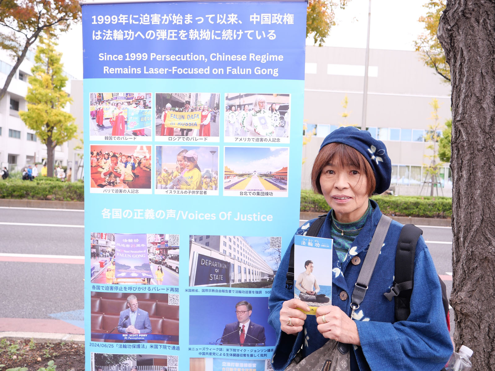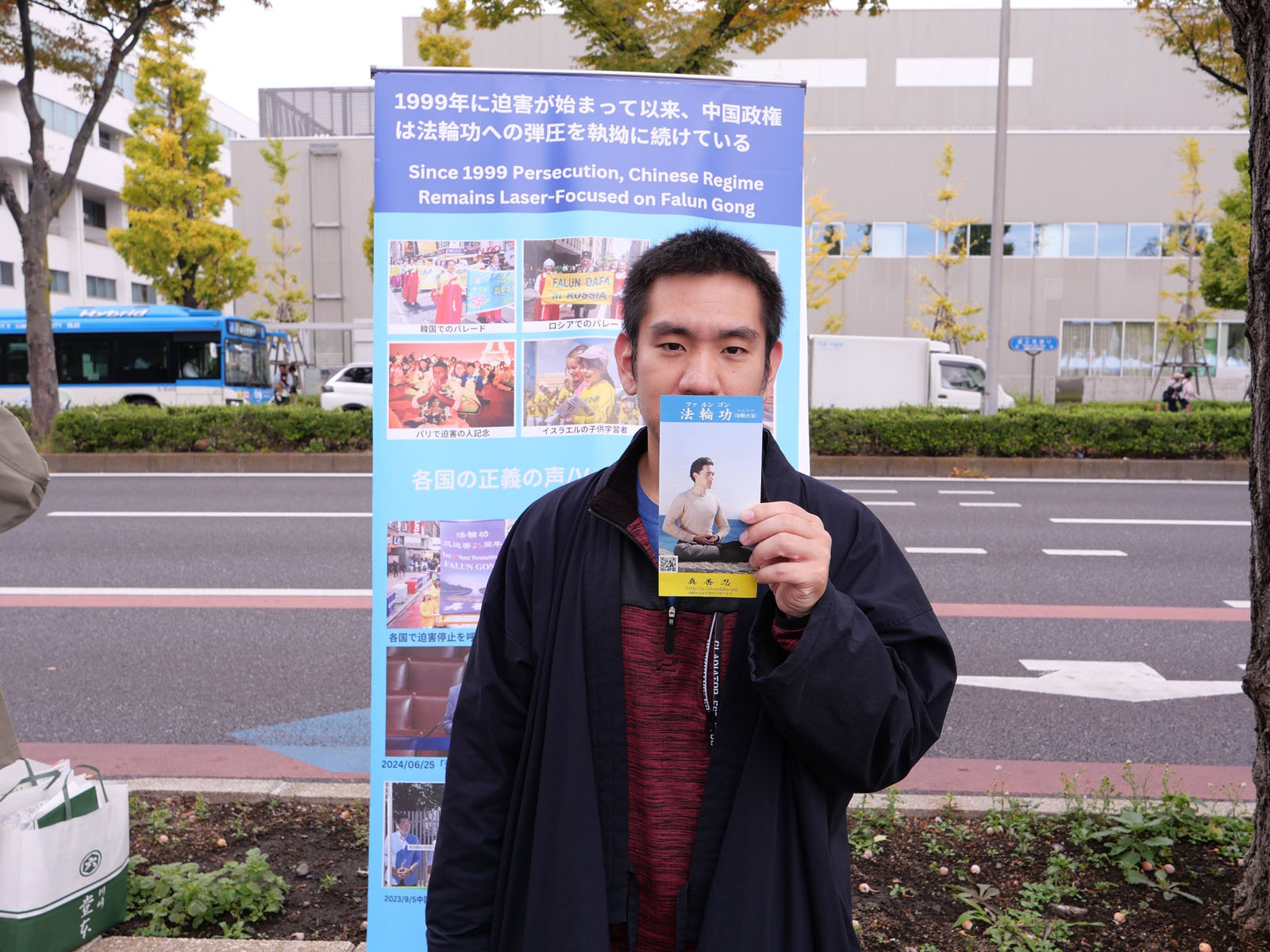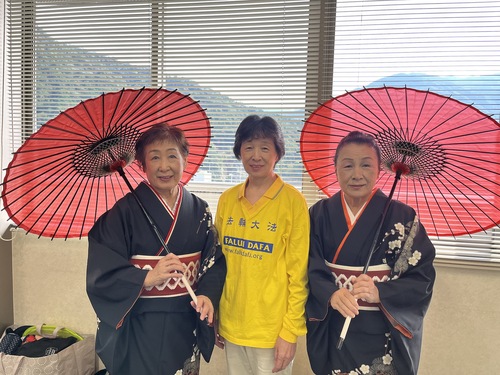 Po rozmowie z praktykującymi i poznaniu Falun Gong, pani Yasuda, instruktorka grupy „Kimono Beauty”, powiedziała, że zgadza się z zasadami Prawdy, Życzliwości i Cierpliwości. Dodała, że gdy będzie miała dzień wolny, uda się do sali ćwiczeń w Centrum Społeczności Kōbe, aby nauczyć się zestawów ćwiczeń, i wymieniła się z praktykującymi danymi kontaktowymi.
