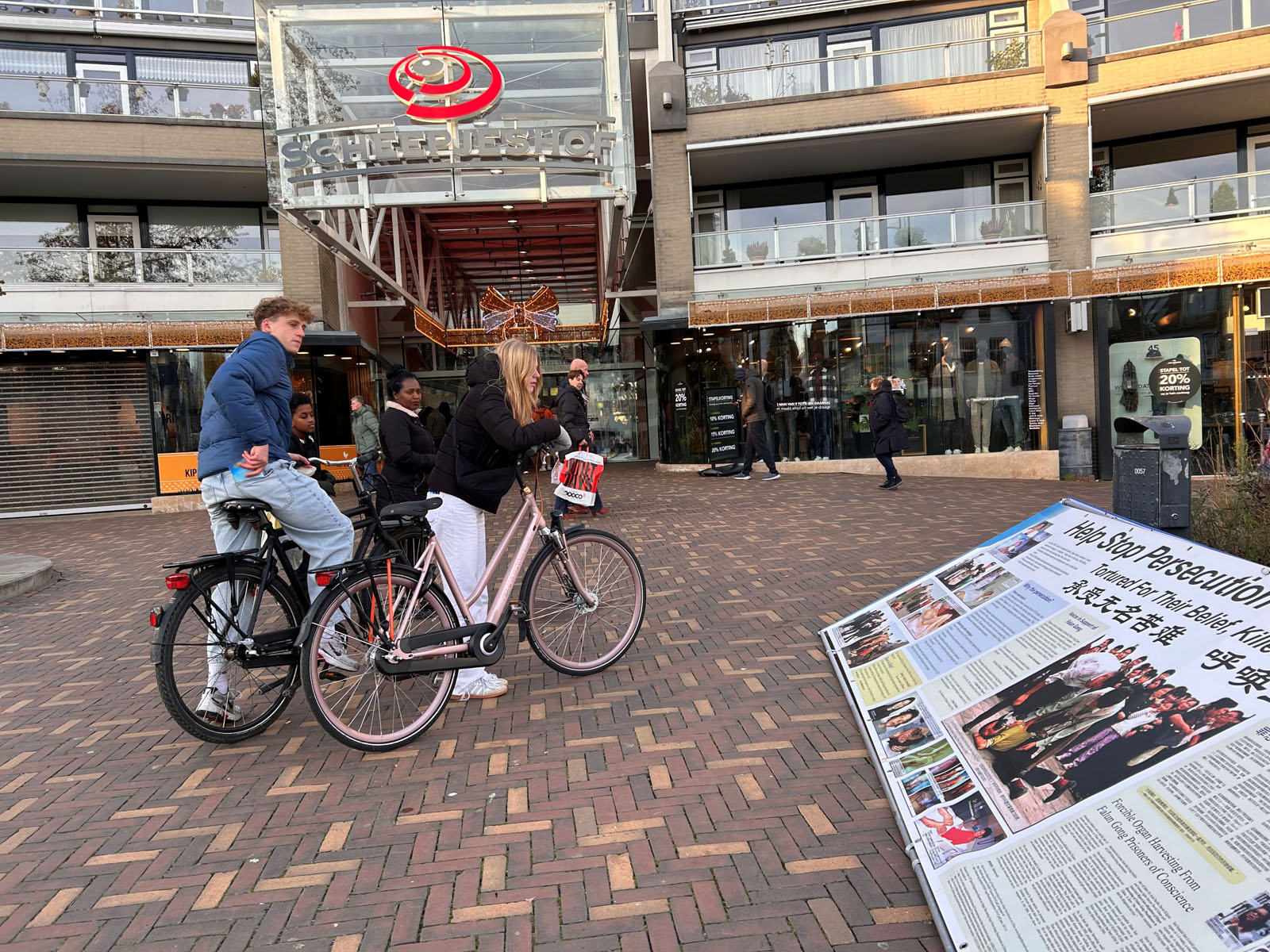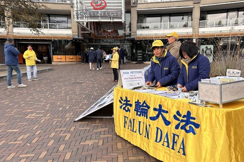 Praktykujący ustawili tablice informacyjne na Hoogstraat około południa 22 listopada. Zaprezentowali ćwiczenia, rozdawali ulotki i opowiadali o 26-letnich prześladowaniach Komunistycznej Partii Chin (KPCh) w Chinach. Ludzie podpisywali petycję wzywającą do zaprzestania prześladowań przez KPCh i sankcjonowanego przez państwo procederu grabieży organów.