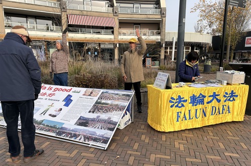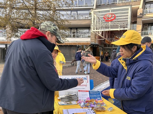 Przechodnie zatrzymali się, aby dowiedzieć się więcej o Falun Dafa i prześladowaniach ze strony KPCh