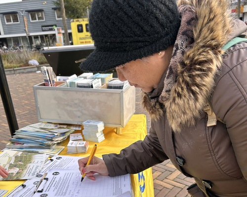 Jeden z mężczyzn przeczytał tablice informacyjne i stwierdził, że KPCh nie uznaje wolności wyznania, brutalnie prześladuje praktykujących Falun Gong i jest brutalnym reżimem. Zapytał, co może zrobić, aby pomóc, i podpisał petycję.