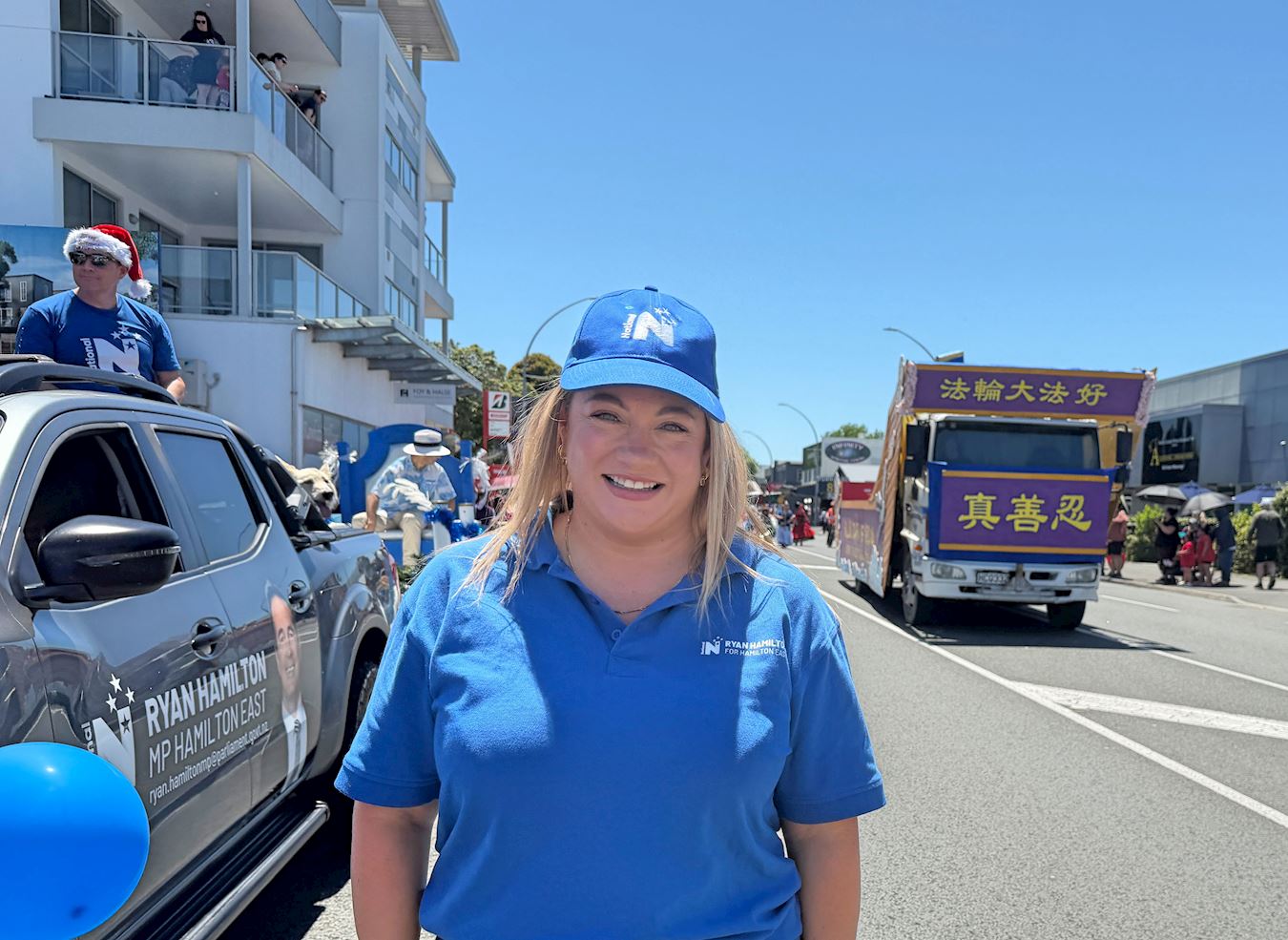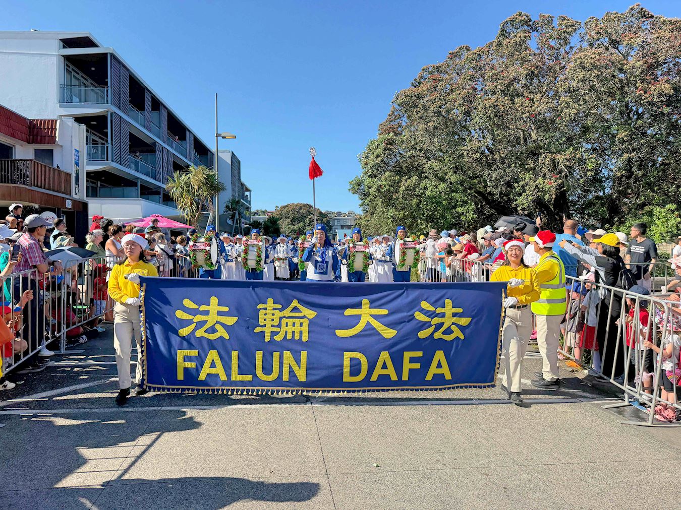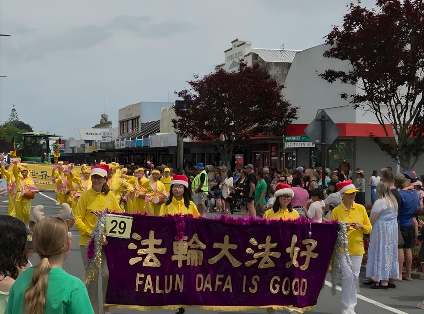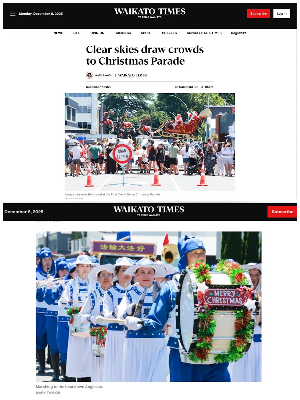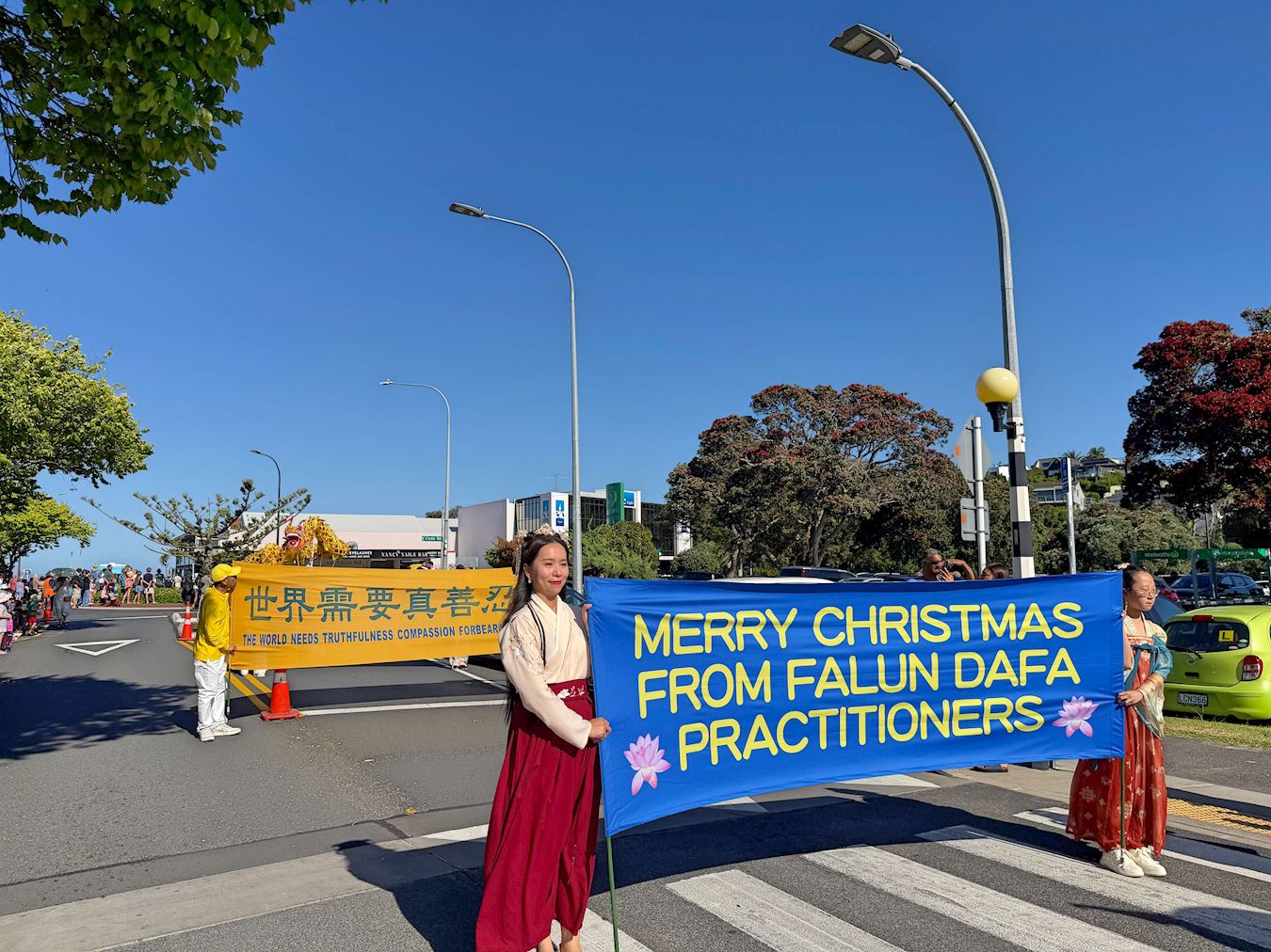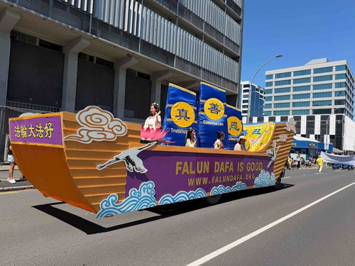 (Minghui.org) Praktykujący z Wyspy Północnej wzięli udział w siedmiu paradach bożonarodzeniowych w dniach 4-7 grudnia 2025 r., co dało im możliwość zaprezentowania Falun Dafa społecznościom lokalnym. Wszystkie siedem parad spotkało się z ciepłym przyjęciem, a wiele osób wyraziło swoje uznanie dla tradycyjnej chińskiej kultury i występów Orkiestry Marszowej Tian Guo. Chwalono również zasady przewodnie Falun Dafa: Prawda, Życzliwość, Cierpliwość.