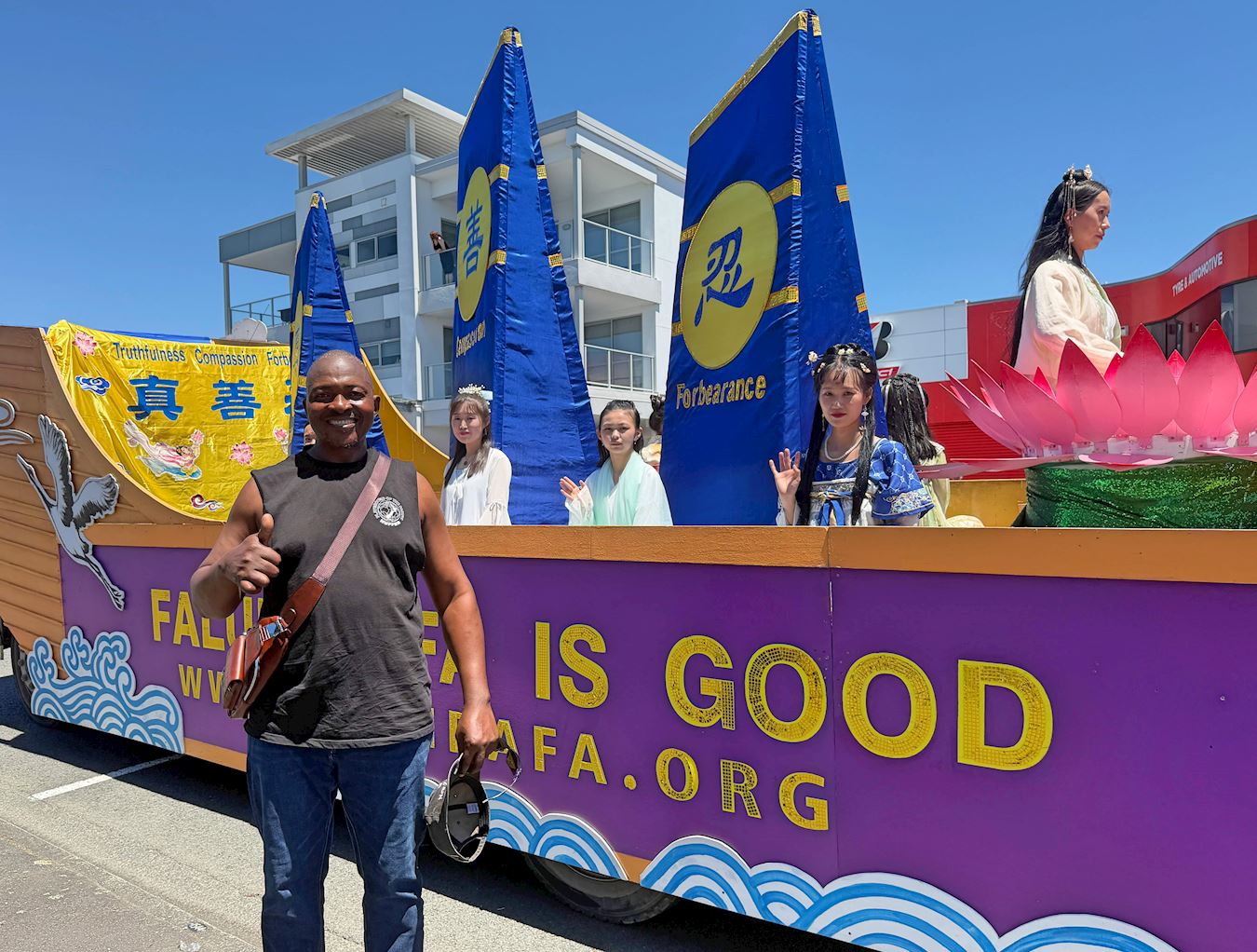 Godfrey powiedział, że trzy miesiące temu przeprowadził się do Nowej Zelandii i pracuje dla firmy górniczej. Po raz pierwszy widział praktykujących Falun Dafa podczas parady. Powiedział, że ich kostiumy były spektakularne. „Bardzo lubię tradycyjną kulturę. Czuję się, jakbym znalazł się w scenie z filmu” – wyjaśnił.