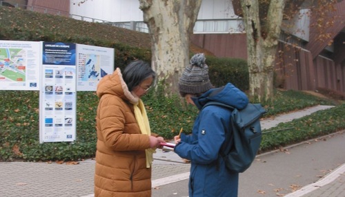 (Minghui.org) Praktykujący Falun Gong z Francji, Niemiec i Szwajcarii zorganizowali 4 grudnia 2025 r. działania w pobliżu dworca kolejowego w Strasburgu. Wydarzenie odbyło się podczas posiedzeń Rady Europy poświęconych kwestiom praw człowieka. Rozdawali ulotki ujawniające prześladowania Falun Gong przez Komunistyczną Partię Chin (KPCh) i zbierali podpisy pod petycją wzywającą do położenia kresu zbrodniom komunistycznego reżimu polegającym na pobieraniu organów od praktykujących Falun Gong uwięzionych za swoją wiarę.