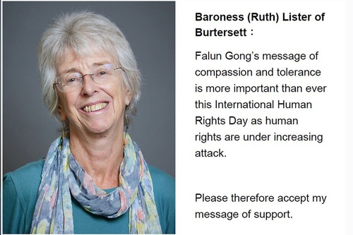 Baronessa (Ruth) Lister z Burtersett napisała: „Przesłanie Falun Gong dotyczące współczucia i tolerancji jest ważniejsze niż kiedykolwiek w tym Międzynarodowym Dniu Praw Człowieka, ponieważ prawa człowieka są coraz częściej naruszane. Proszę zatem przyjąć moje przesłanie wsparcia”.