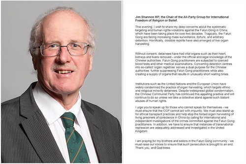 „Wzywam Państwa do zabrania głosu w imieniu tych, którzy nie mogą mówić za siebie – musimy dopilnować, aby KPCh nie mogła działać bezkarnie. Musimy również opowiedzieć się za etycznymi praktykami transplantacyjnymi i pomóc powstrzymać przymusowe pobieranie organów od żywych więźniów sumienia w Chinach, wzywając do międzynarodowego i niezależnego śledztwa w sprawie zbrodni popełnionych na praktykujących Falun Gong. Ponadto musimy dopilnować, aby przypadki represji transgranicznych były odpowiednio rozpatrywane i badane w Wielkiej Brytanii”.