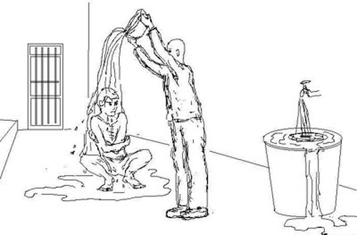 Inna więźniarka napełniła balony kałem i moczem. Następnie przekłuła je i spryskała szyje, usta, nosy, oczy i twarze praktykujących.