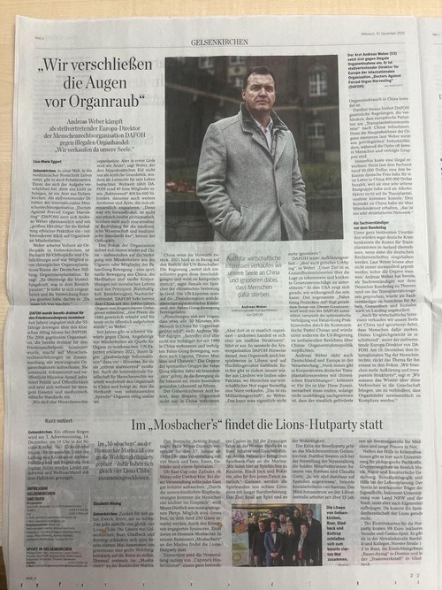 (Minghui.org) Lokalne wydanie gazety Westdeutsche Allgemeine Zeitung (WAZ) w Gelsenkirchen opublikowało 10 grudnia 2025 r., w Dzień Praw Człowieka, artykuł zatytułowany „Przymykamy oko na pobieranie organów”. Wzywa ona Niemcy do zwrócenia uwagi na sankcjonowane przez państwo przymusowe pobieranie organów przez Komunistyczną Partię Chin (KPCh).
