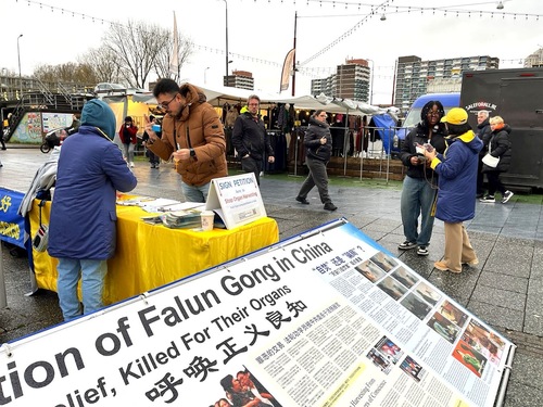 Praktykujący Falun Gong, znanego również jako Falun Dafa, ustawili tablice informacyjne na placu Buikslotermeer, pokazali ćwiczenia, rozmawiali z ludźmi i rozdawali ulotki. Przedstawili Falun Gong i zwiększyli świadomość na temat trwającego od 26 lat prześladowania przez Komunistyczną Partię Chin (KPCh). Mimo że podczas wydarzenia padał deszcz, wielu przechodniów zatrzymało się, aby dowiedzieć się więcej.
