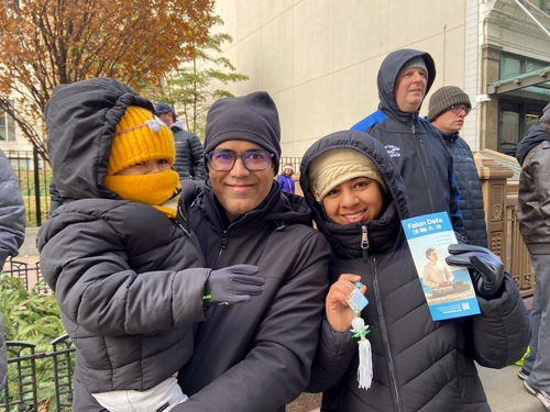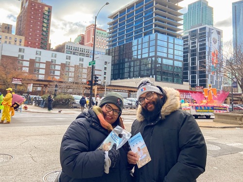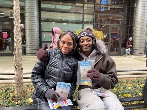 Mieszkańcy Chicago, Gomez i jego żona Gaby, powiedzieli, że cieszą się, że dowiedzieli się o Falun Dafa. Gaby powiedziała: „Chciałabym dowiedzieć się więcej o tej praktyce”. Była zadowolona, widząc platformę Falun Dafa. Powiedziała: „Platforma jest wspaniała! Cieszę się, że was tu widzę”.